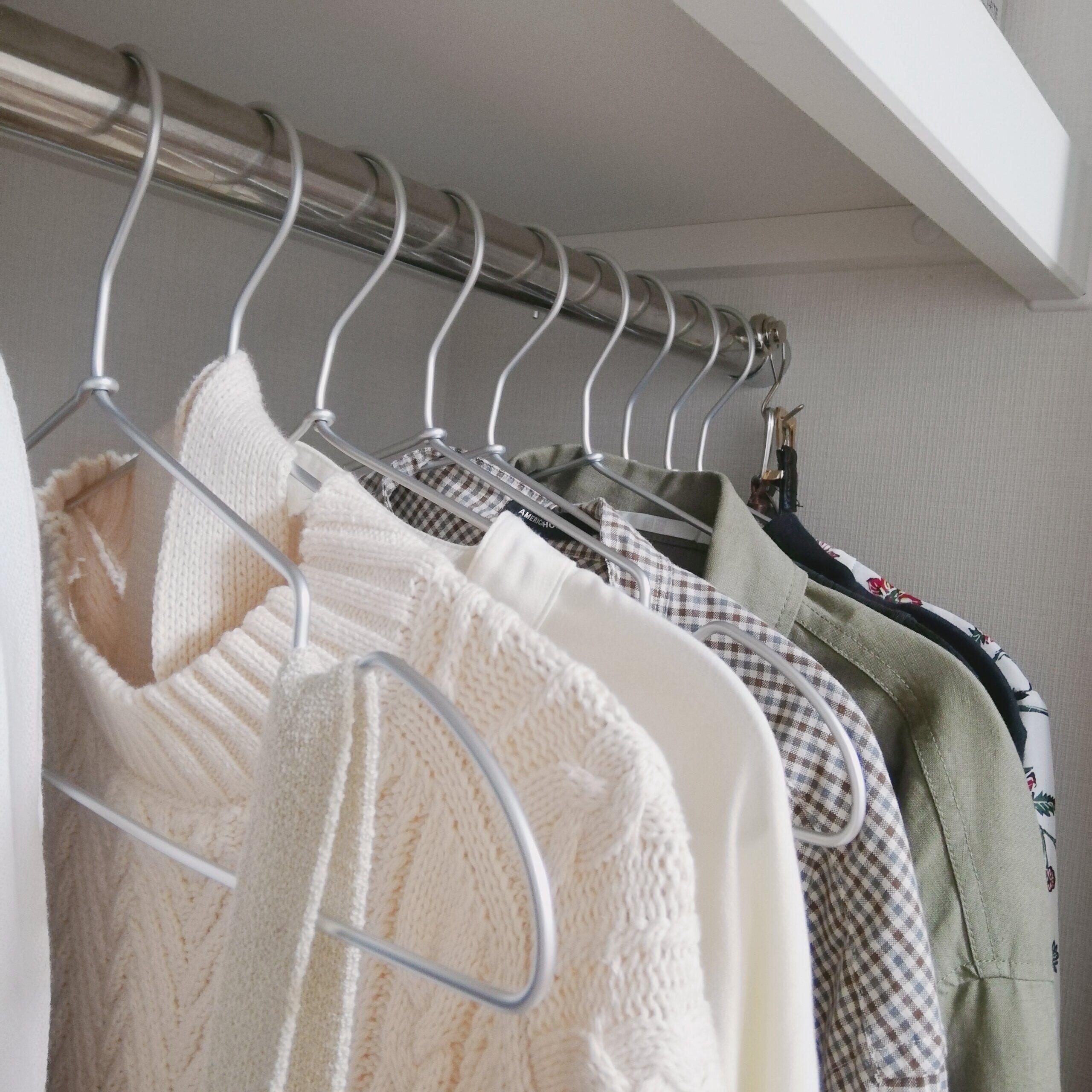 洗濯用はもちろん、そのままクローゼットの掛ける収納としても使用している無印良品のアルミハンガー。