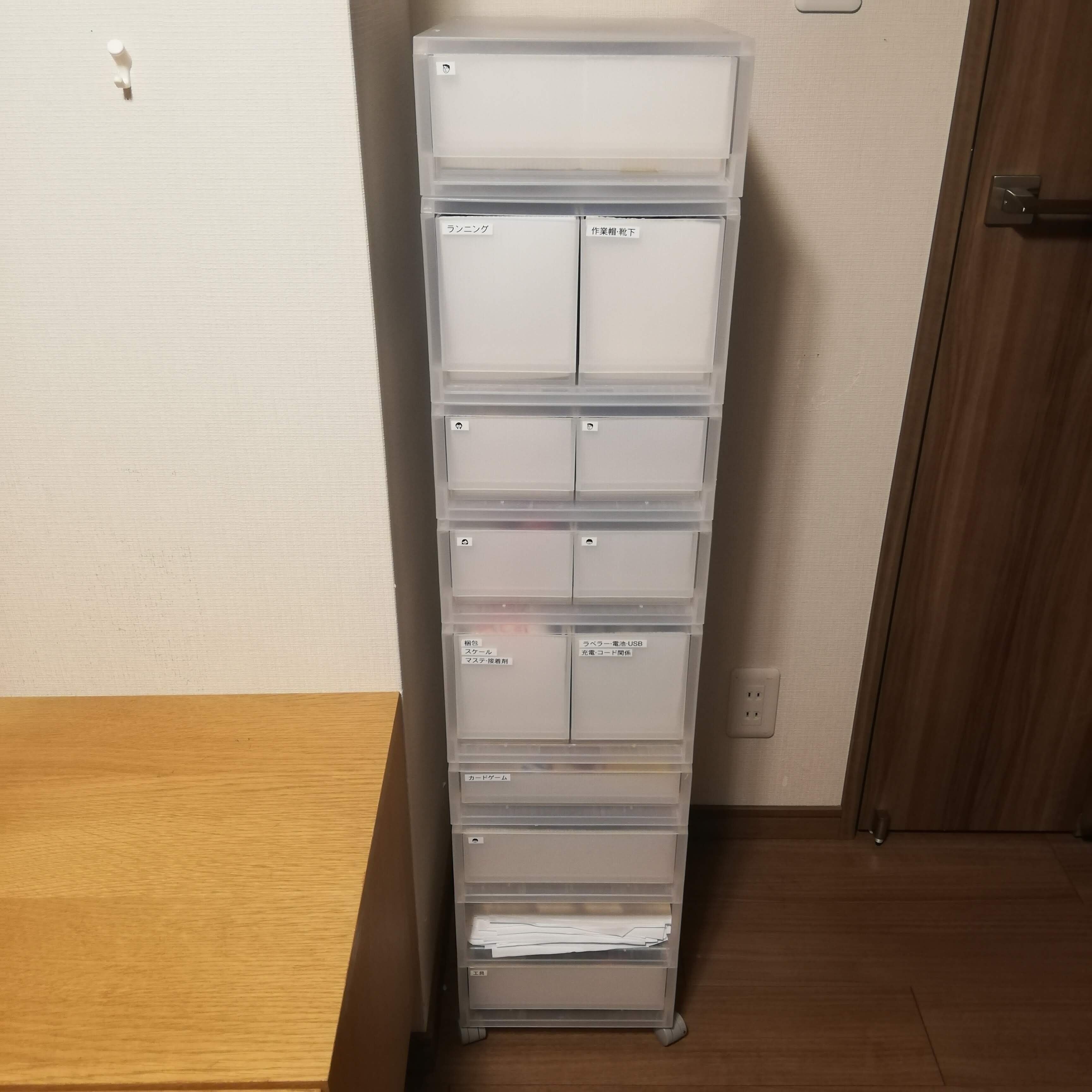 我が家では、子どもと夫管理の小物収納や家族分の靴下、梱包材や工具関係まで細々した物を収納しています。