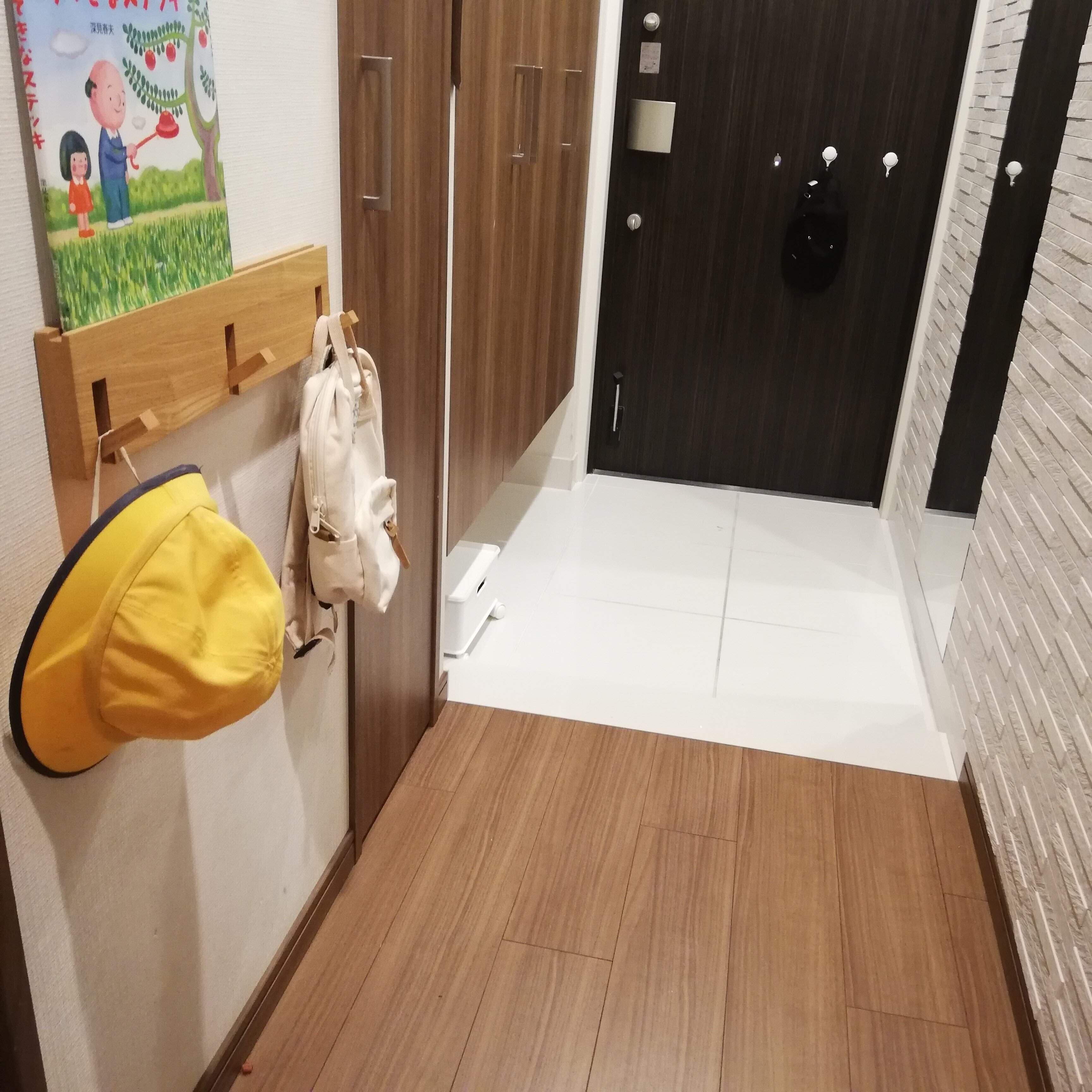 子どもの幼稚園道具の身支度コーナーは、壁に付けられる家具・3連ハンガー1つで事足りています。
