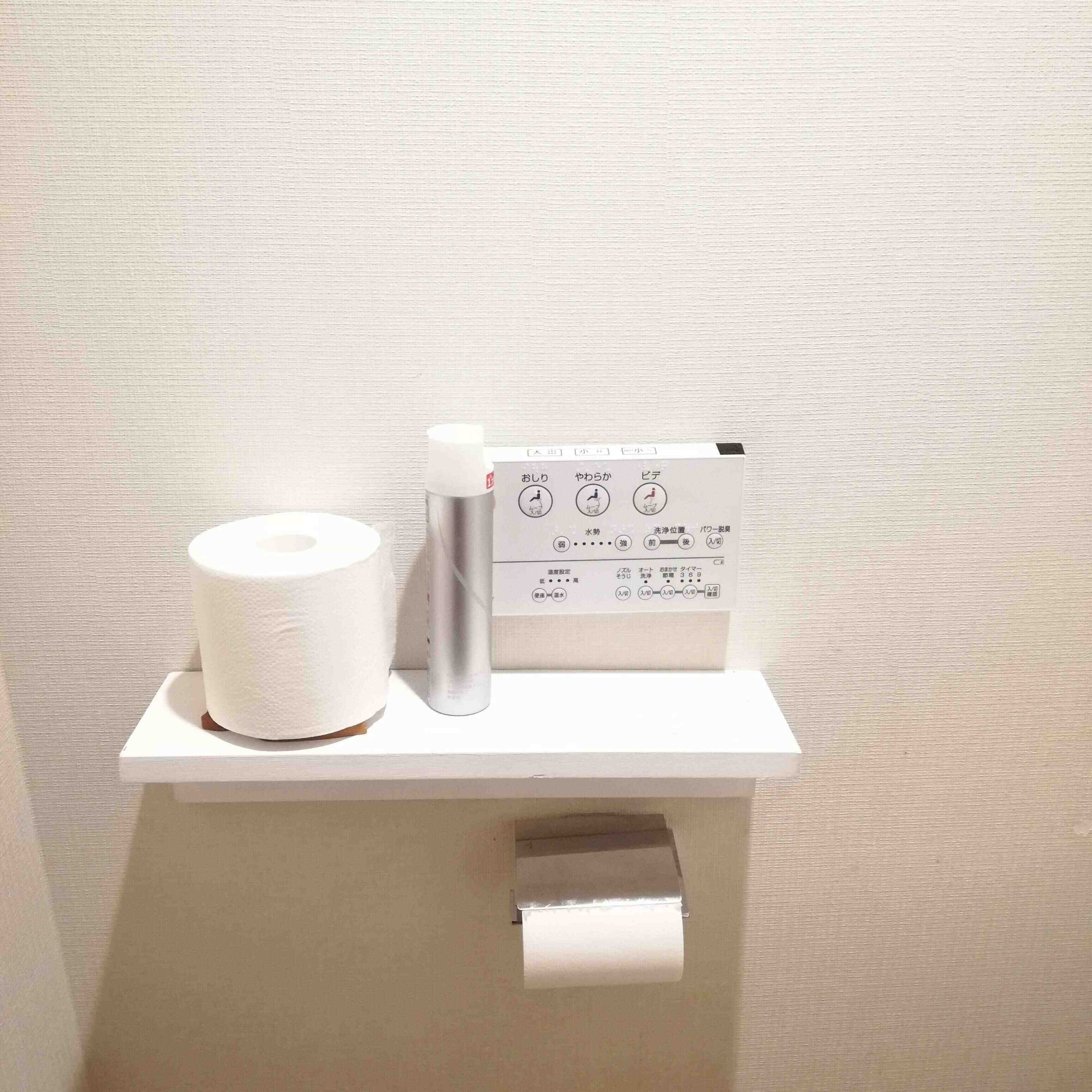 トイレットペーパーや消臭スプレーを置いたりと実用的です。