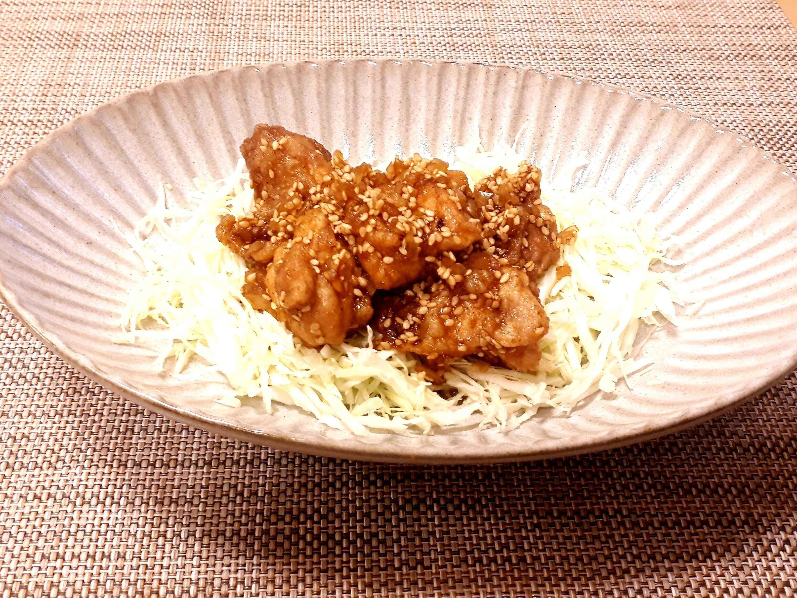 上の写真は、きざみらっきょうの甘酢だれ:しょうゆを3:1で混ぜ合わせたものをからめた唐揚げです。千切りキャベツの上に唐揚げをのせてあまったタレをかけると、タレがキャベツにしみ込んでキャベツまで絶品になります。