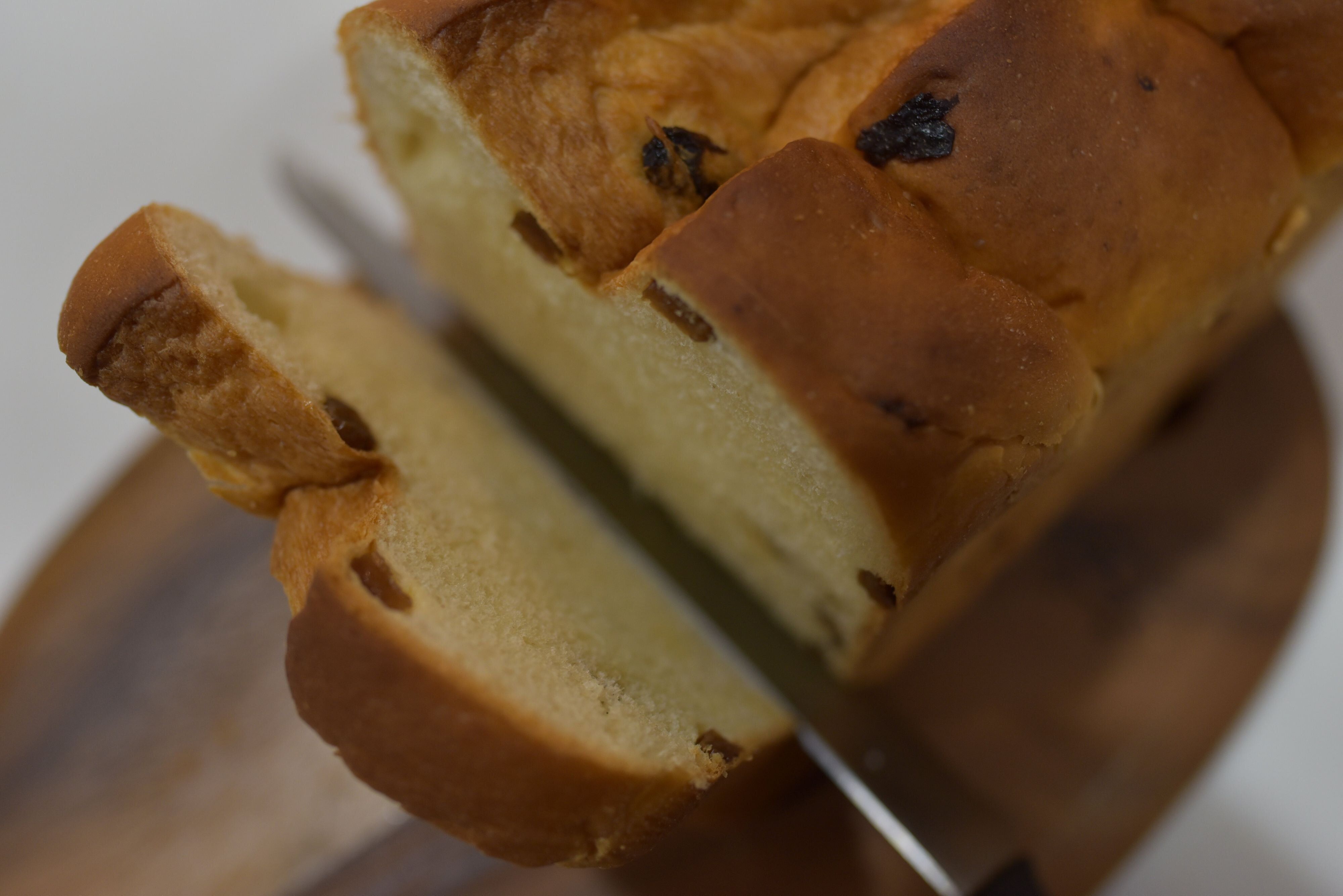 最後にご紹介するのは「山型レーズン食パン」。高さ約12cm×幅約10.5cm×長さ17cmで、断面がきめ細かく、程よい量のレーズンが入っています。