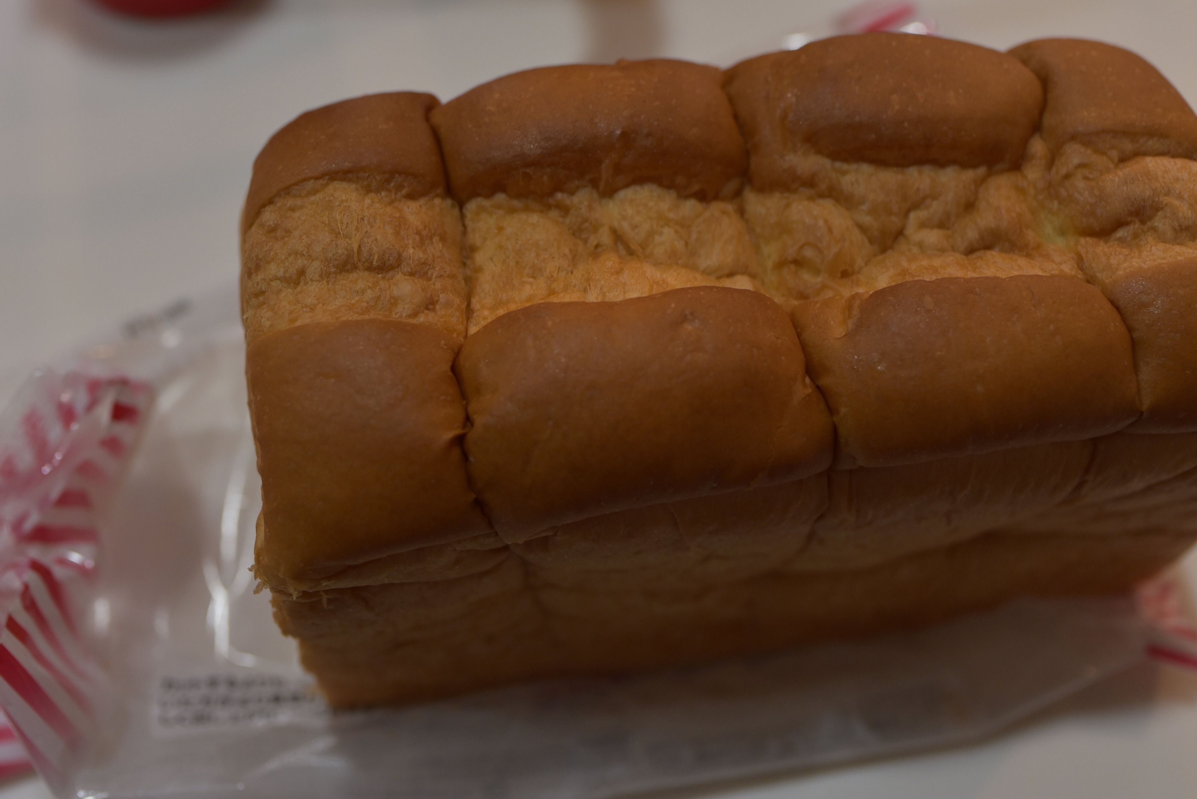 最初に食べたのは、「天然酵母食パン」。高さ約14cm×幅約11cm×長さ約24cmで、普通の食パンの2倍ほどのサイズです。