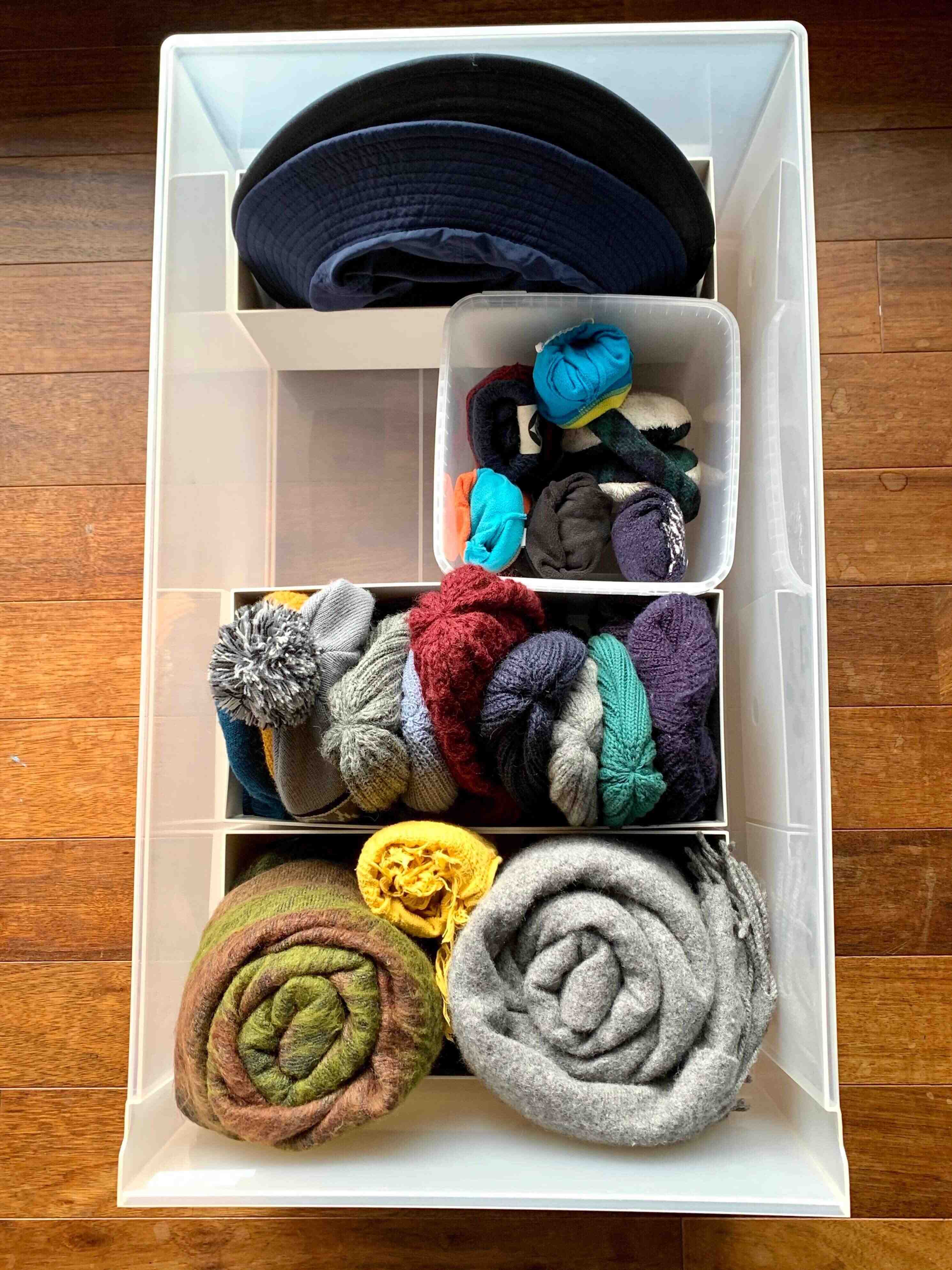 マフラーや手袋、帽子などの小物類を衣装ケースに収納する場合も、ファイルボックスを使用すれば、衣装ケースの中がごちゃごちゃするのを防ぐ事ができます。
