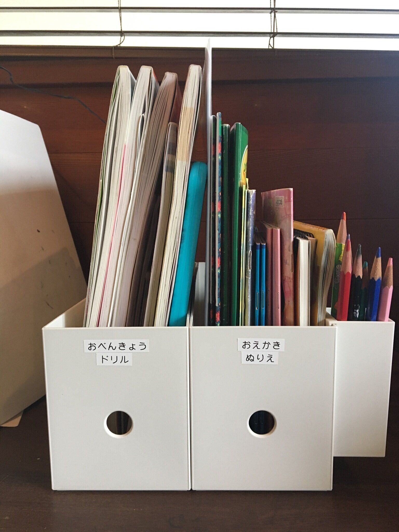 我が家の子どもたちは、普段リビング学習をするので、リビングにお勉強のドリルや、ぬりえセットを収納しています。