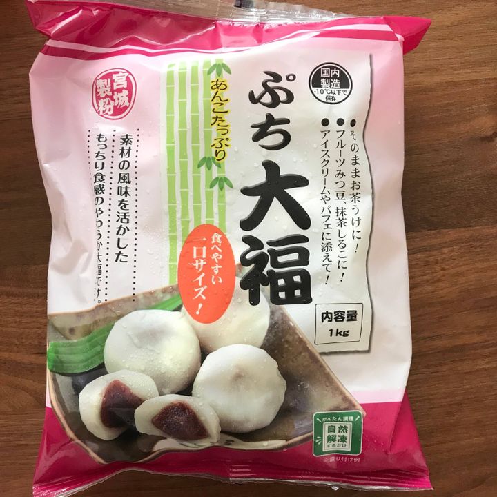 続いては和菓子!ワッフルと同じく冷凍品です。ひとくちサイズの小さな大福がゴロゴロと1キロも入った商品。