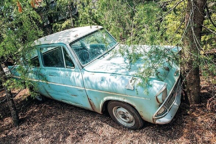 ハリー・ポッター™エリアの入り口から続く小道の途中、木々の間にこっそり現れる壊れた青い車。こちらは映画で、ハリーとロンが乗っていた物。空を飛ぶ車として重要な役目を果たしています。