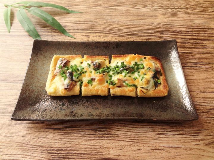 オイルサーディンの油揚げピザもつくりました。材料はオイルサーディン1缶、油揚げ2枚、ピザ用チーズ20g、ネギ適量。油揚げに材料を乗せてトースターで焼くだけ!食べるときにしょう油やポン酢を少量かけて食べるのがオススメです。