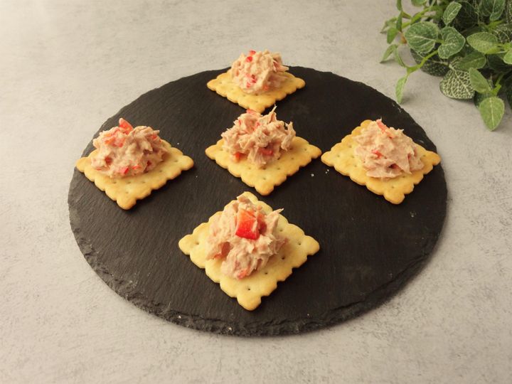 クラッカーを使ったわが家の定番おつまみはカナッペ。ツナ缶1缶、パプリカ1/2個、マヨネーズ大さじ1を混ぜて乗せました。ツナ缶プラス野菜で彩りのいいカナッペになります。