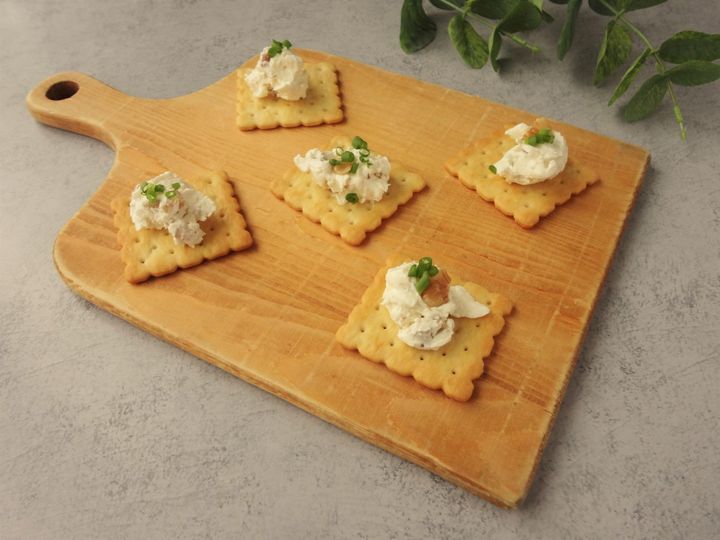 クリームチーズを使ったカナッペも作りました。材料はクリームチーズ30g、クルミ10g、白だし小さじ1/2、小葱適量。クリームチーズと白だし、クルミを混ぜてクラッカーに乗せ、小葱を散らせば完成。