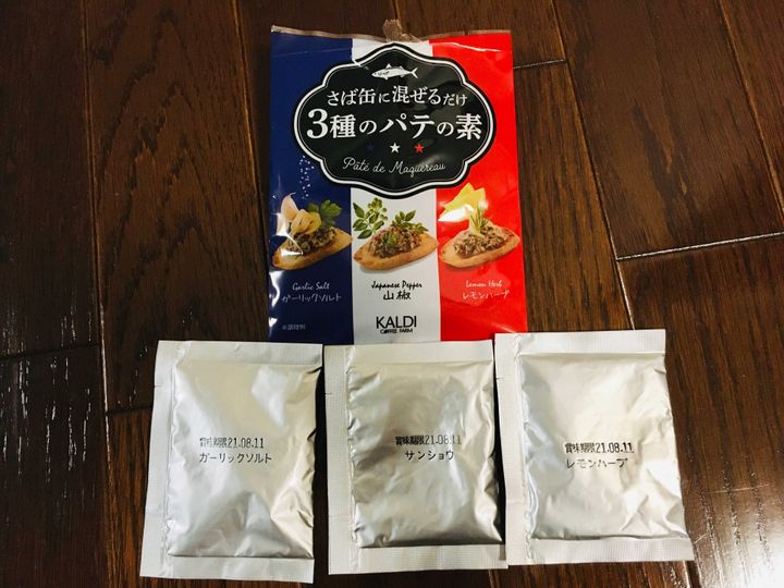 カルディのオリジナル商品「さば缶に混ぜるだけ 3種のパテの素」。3袋入りで198円です。近所の店舗では入り口にたくさん積んであったので、いまイチオシの商品なのかもしれませんね。