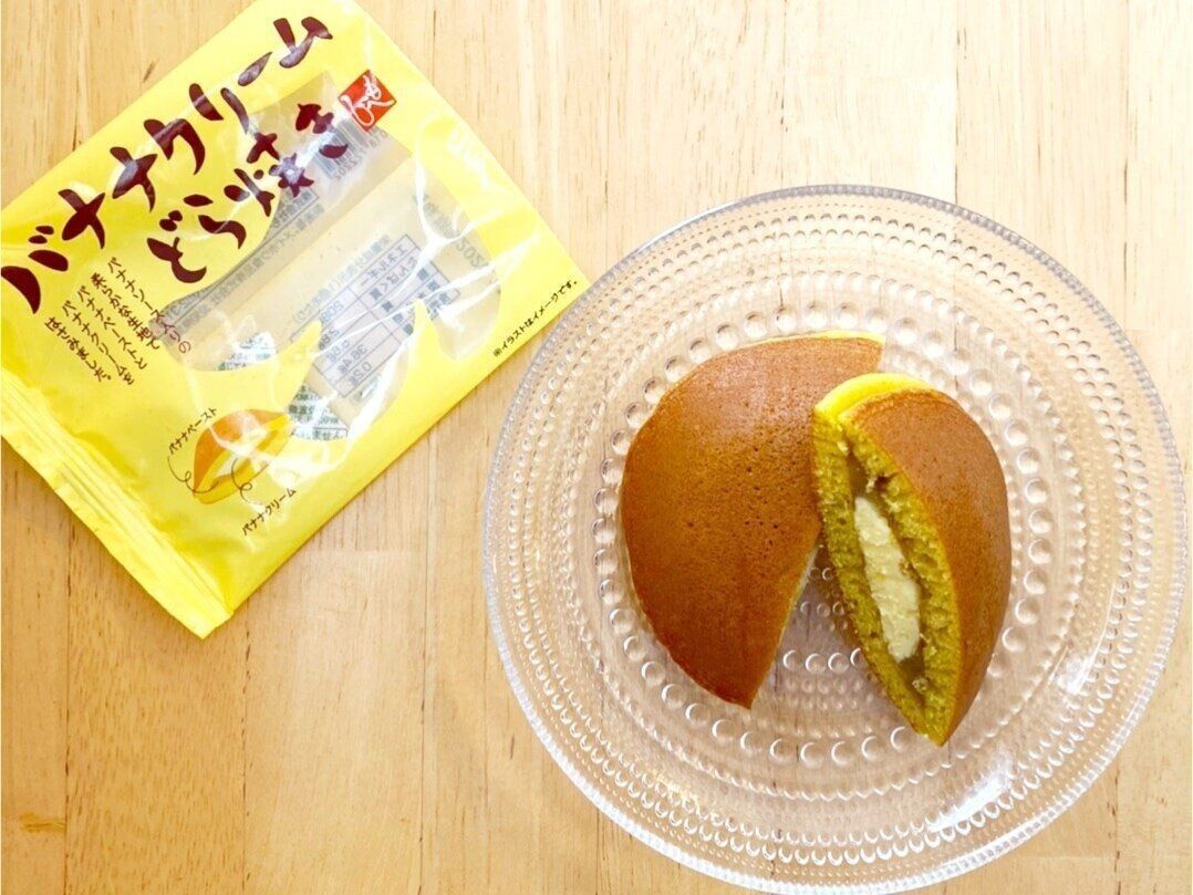 バナナソース入りの生地でバナナペーストとバナナクリームをサンドしたどら焼き。