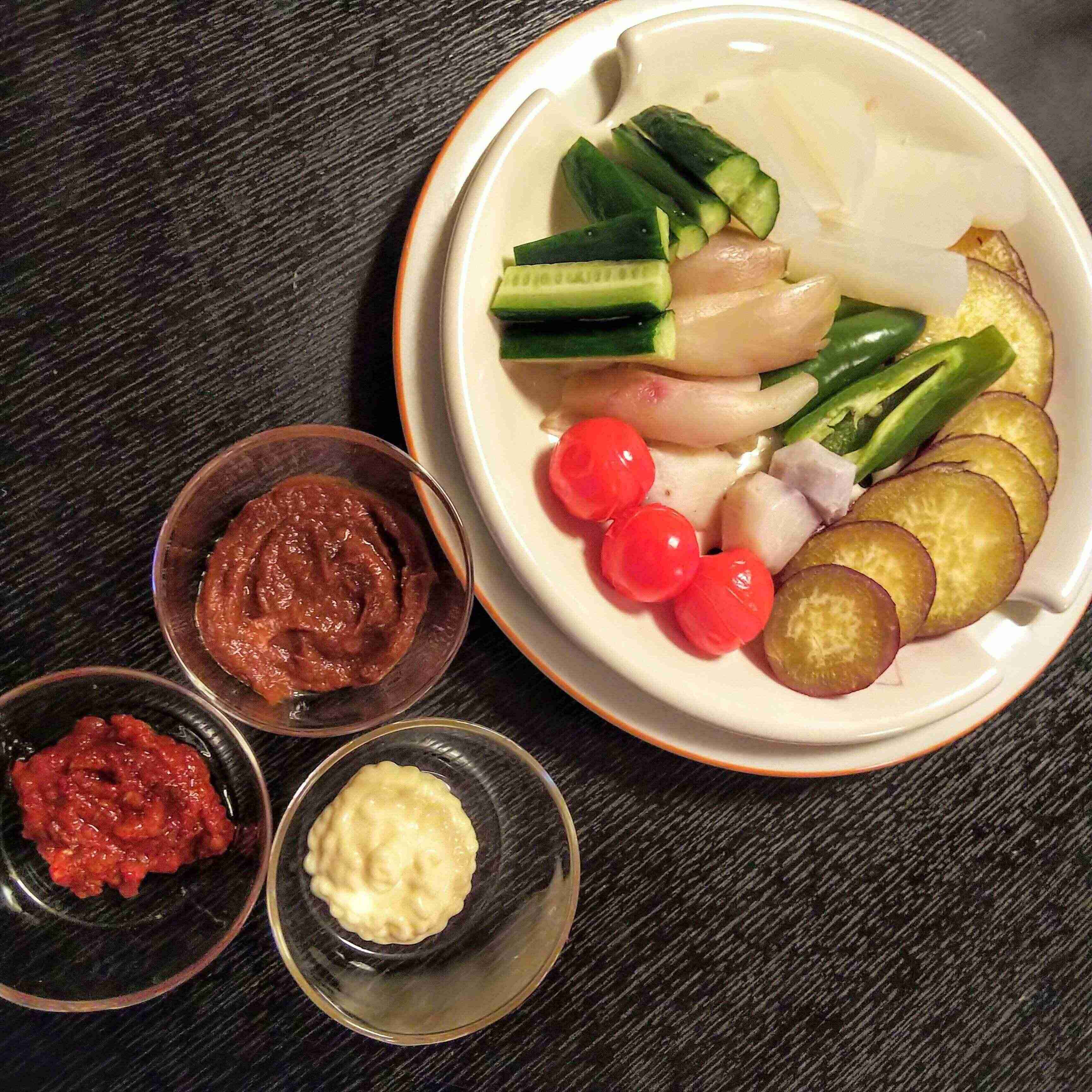 蒸し野菜のディップとして、マヨネーズ、味噌、ハリッサを用意してみました。