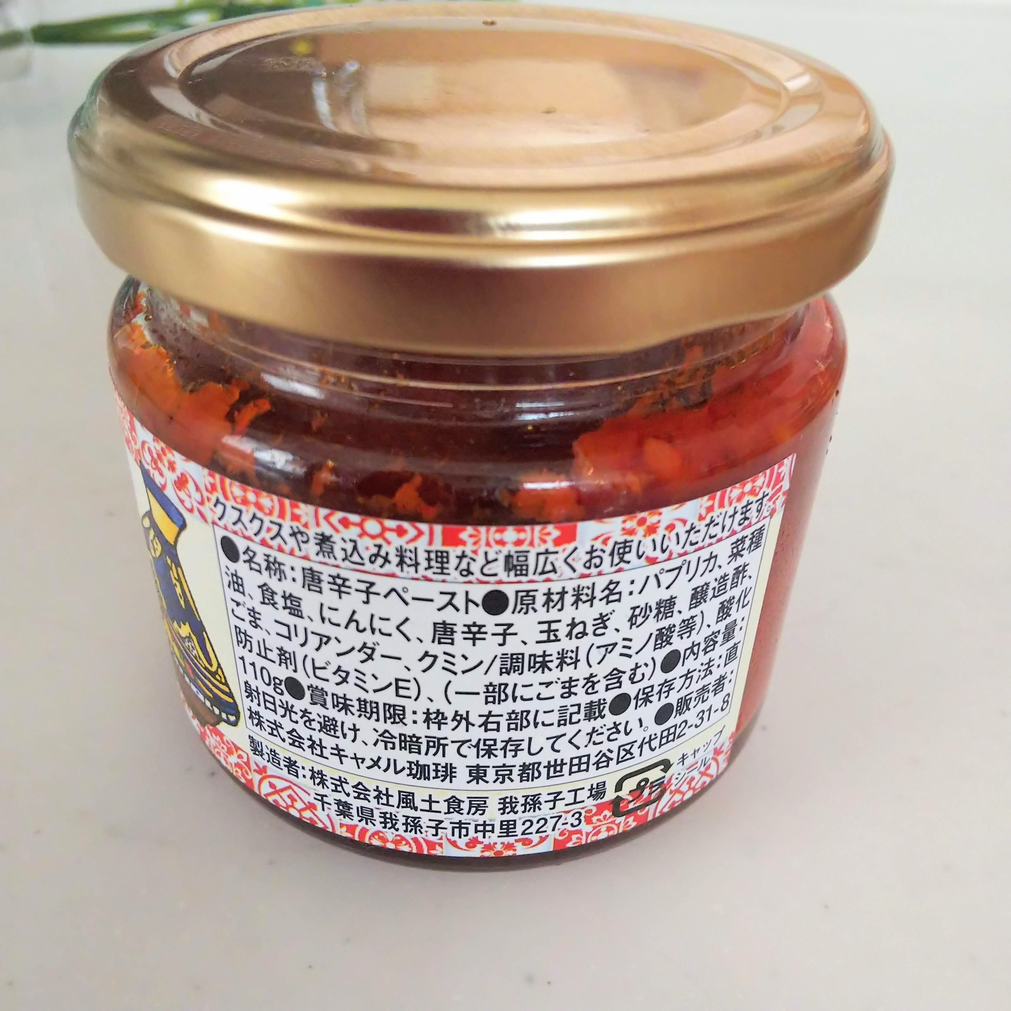 名称は唐辛子ペースト。原材料には唐辛子、玉ねぎ、パプリカ、にんにく、コリアンダー、クミンなどが入っています。唐辛子ペーストというほど辛くはありません。