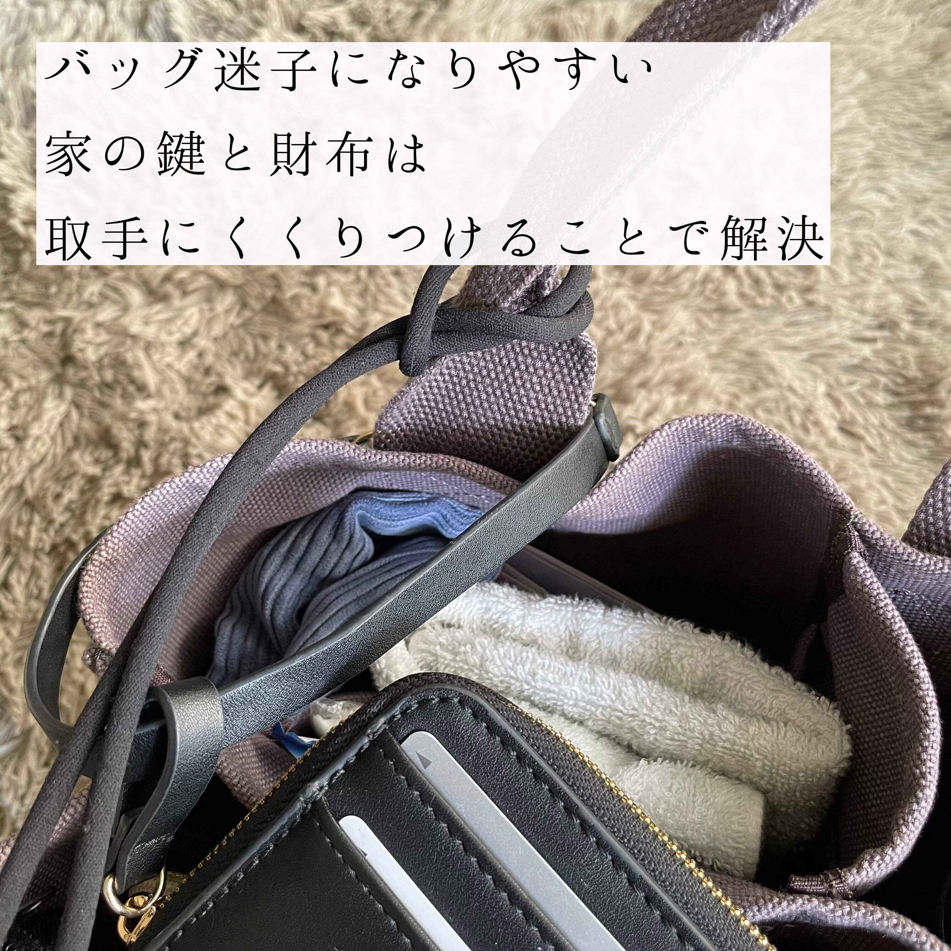 特に、バッグの中で迷子になりやすい鍵や財布は、カバンの取っ手にくくりつけることで解決しました。
