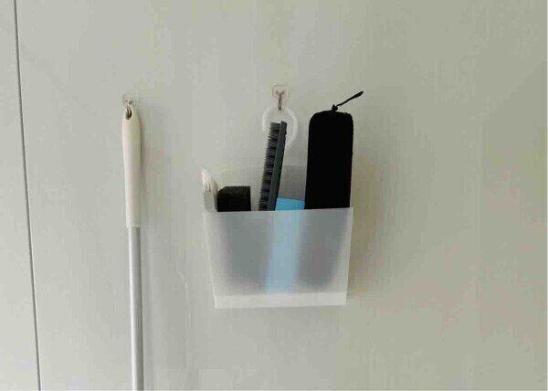 こちらの商品、本当は洗濯ばさみを収納するためのアイテムなのですが、これがお風呂掃除用品の収納にピッタリ!そこが網状になっているので、水キレもよく、フックもついているので吊るして収納ができるんです。