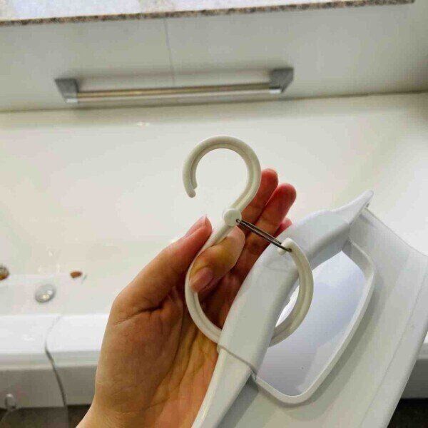 そこでわが家では、たためるバケツにセリアの「ストッパー付きS字フック」をつけてポールにかけて収納しています。この方法にしてからバケツにもカビができることはなくなりました。使用するときにすぐ取り出せ、使い終わったときも濡れたまましまえるので家事の時短にも役立っています。