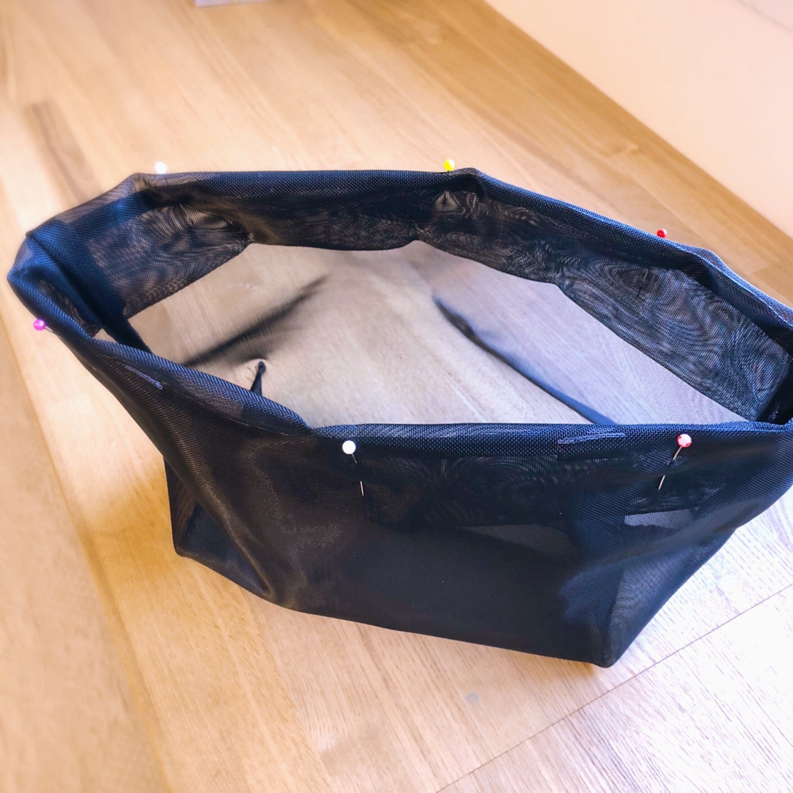DAISOのマチなしメッシュバッグ、200円商品のものです。シンプルでハリのある素材なので、バッグインバッグに向いています。