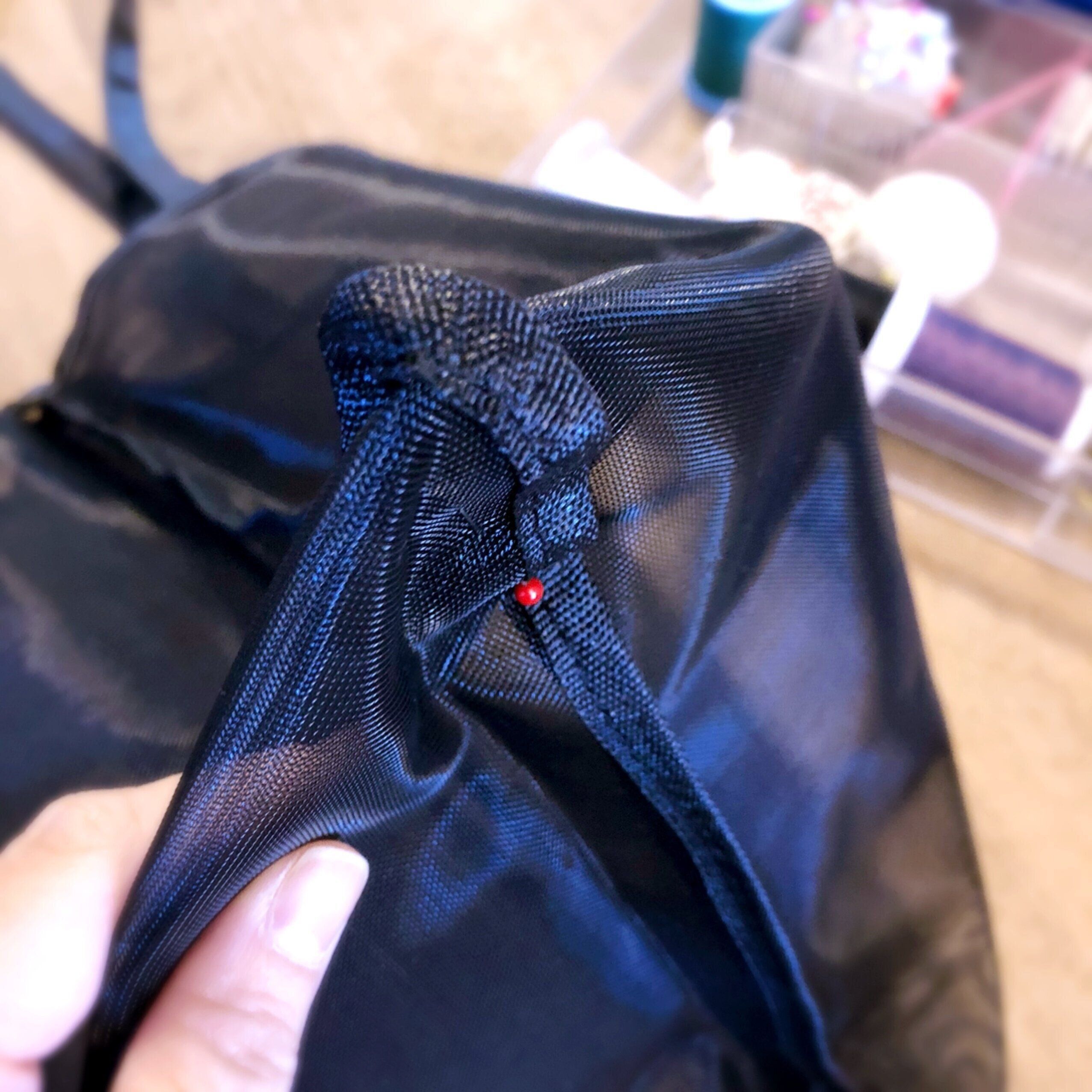 かばんの中身の整理のためにはマチが必要です。今回は10cmのマチを取りました。角を三角にして縫い目を合わせてまち針を打ち、チャコなどで線を引けば簡単に縫えます。