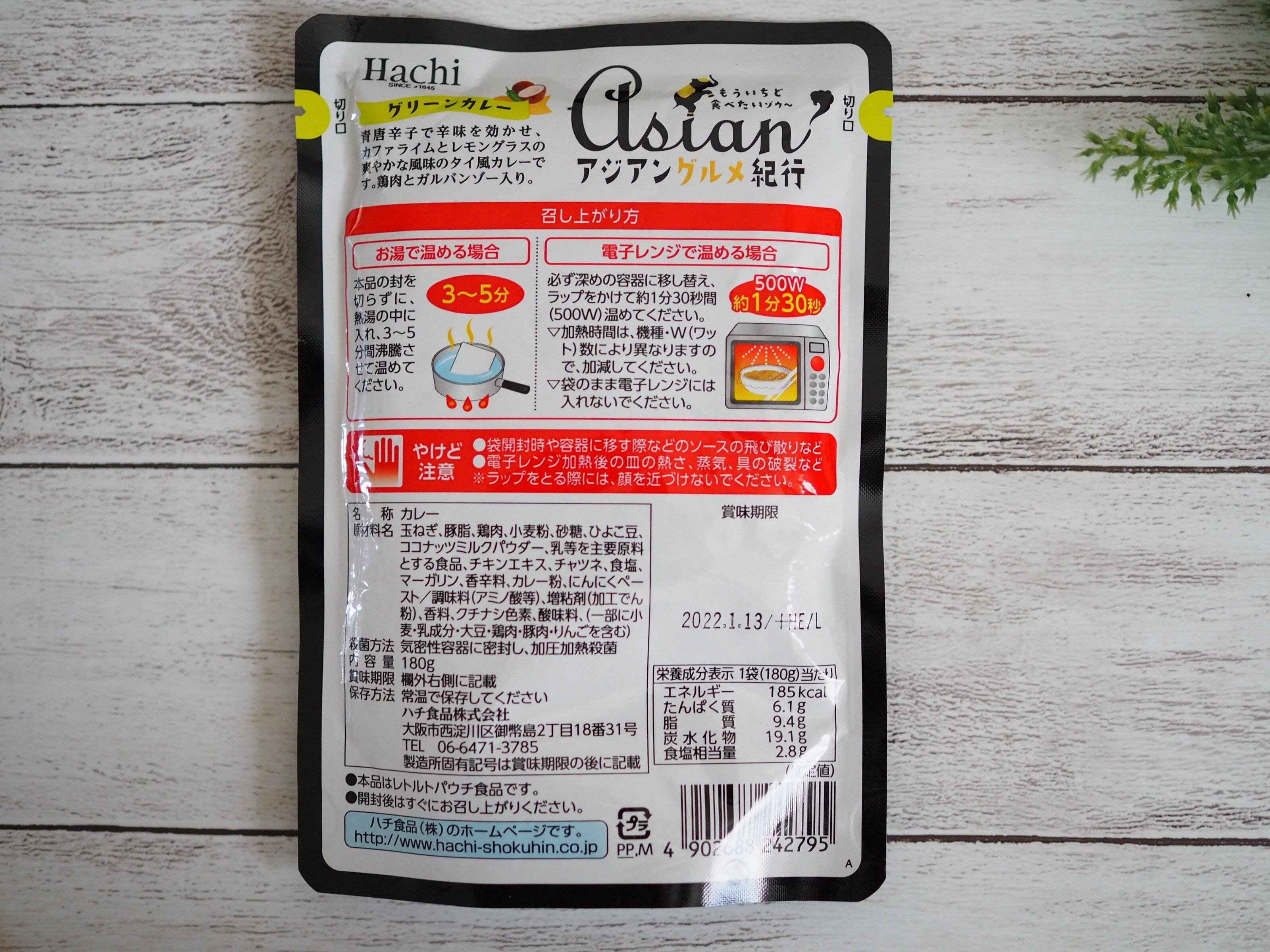 100円と侮るなかれ、けっこう本格的な味わいのハチ食品の「グリーンカレー」。常備しておくと、ランチなどでサッと食べることができて大助かりです。