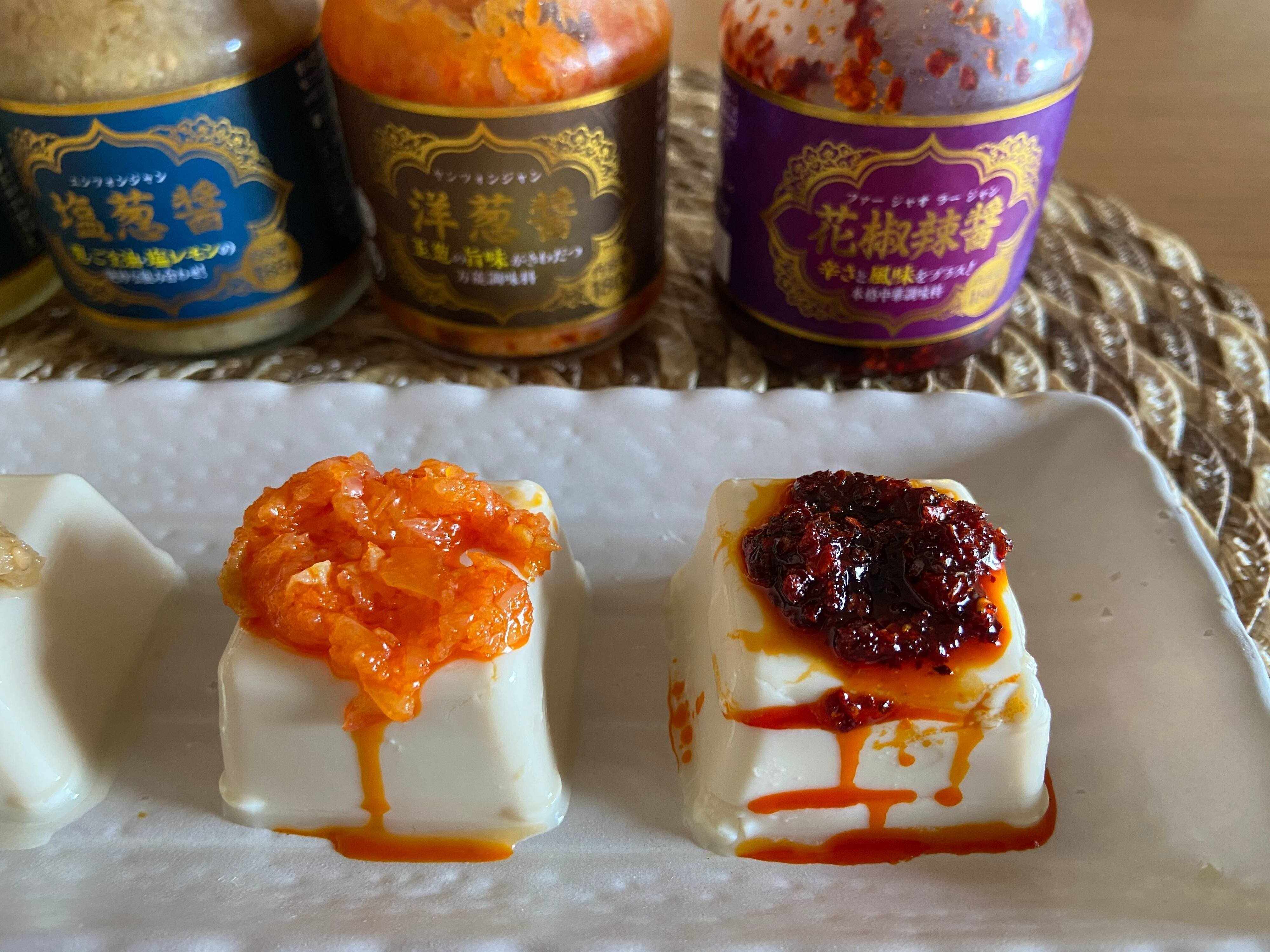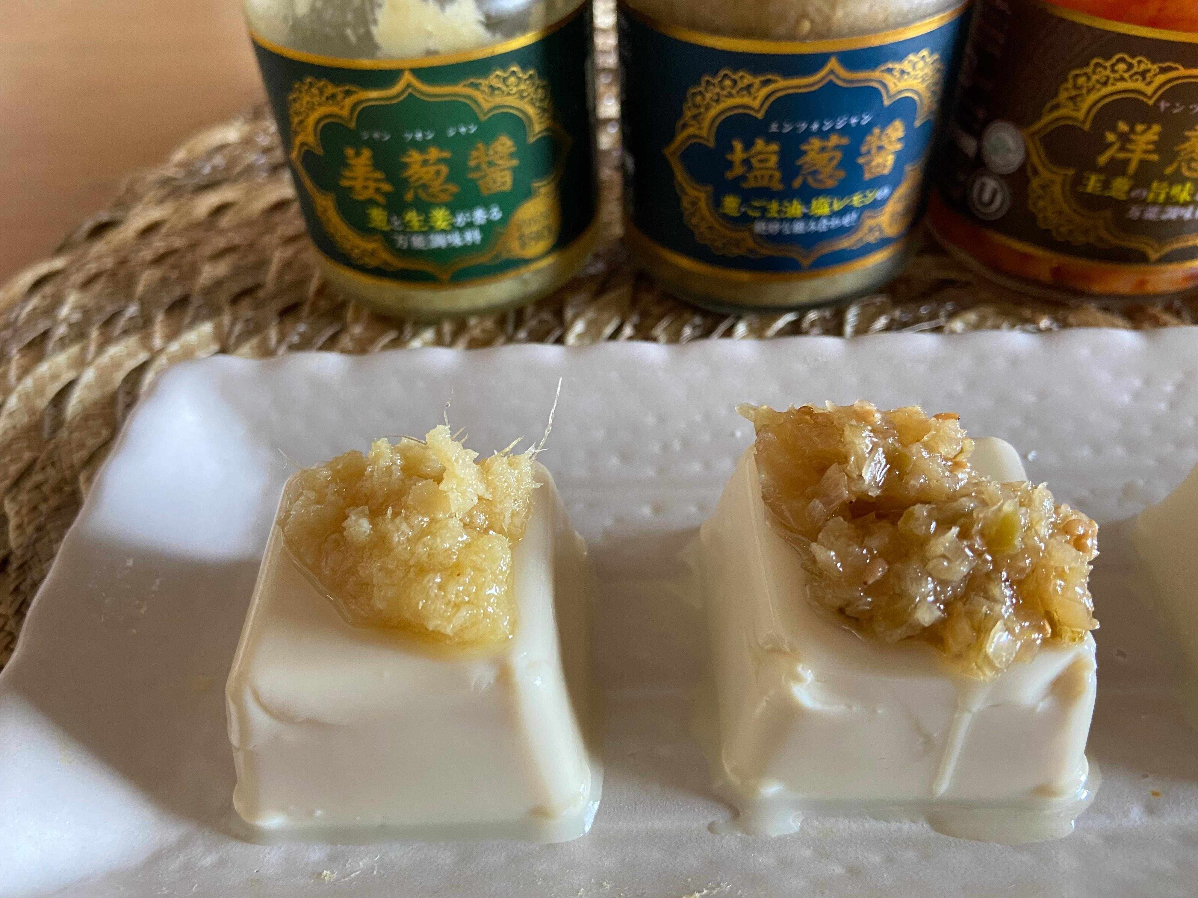 一番左の姜葱醤(ジャンツォンジャン)はねぎ油にたっぷりの生姜が入った、醤シリーズを代表する人気調味料。冷奴にのせるとシンプルにそのおいしさが味わえます。ただ生姜をのせるだけよりも旨みがたっぷりでワンランクUPのおいしさです。