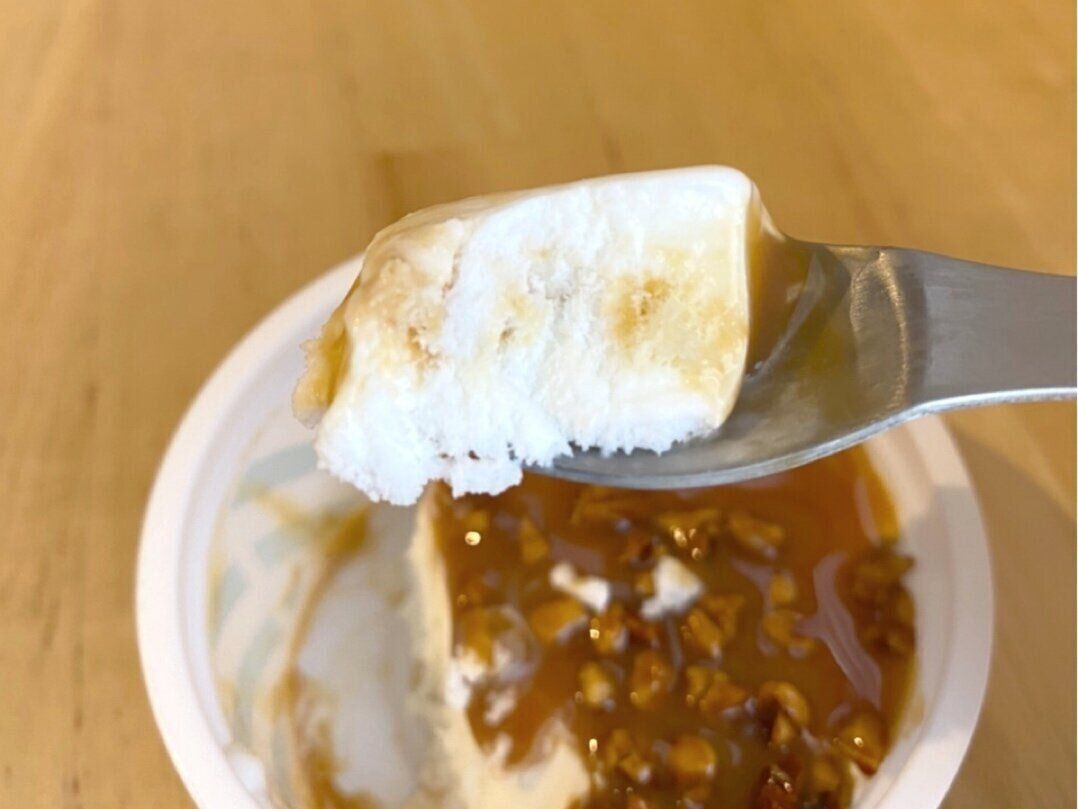 スポンジ入りのミルクアイスの上に、濃厚なキャラメルソースと飴かけアーモンドがのっています。