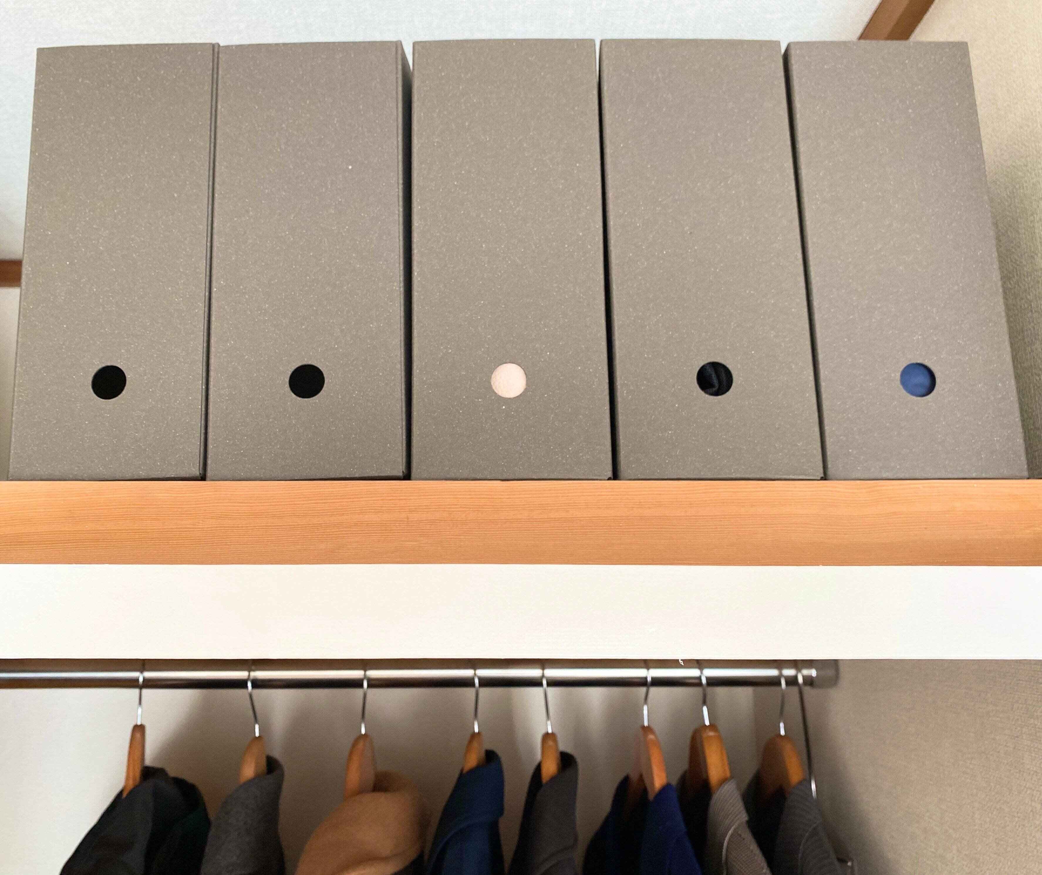 中身を入れたファイルボックスをクローゼット上段に5つ並べて置いてみましたが、ダークグレーの落ち着いたカラーリングの効果もあり、すっきり見えます。
