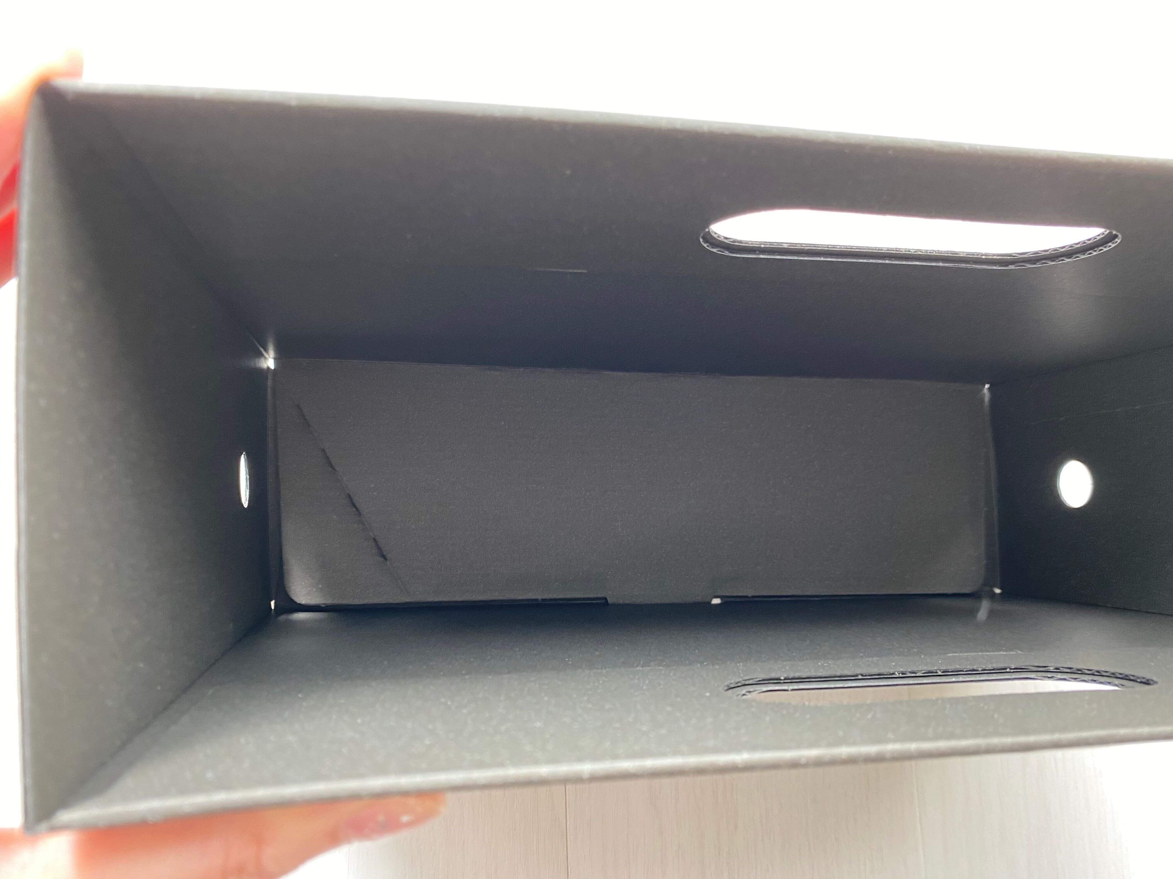店頭では畳まれた状態で販売されていますが、組み立てはとっても簡単。本体を広げて、底のツメ部分を1ヵ所はめ込むだけで完了です!本商品はベージュとダークグレーの2色展開ですが、筆者のおすすめなはダークグレー。パッと見ダンボール素材を感じさせず、高見えするのが魅力!