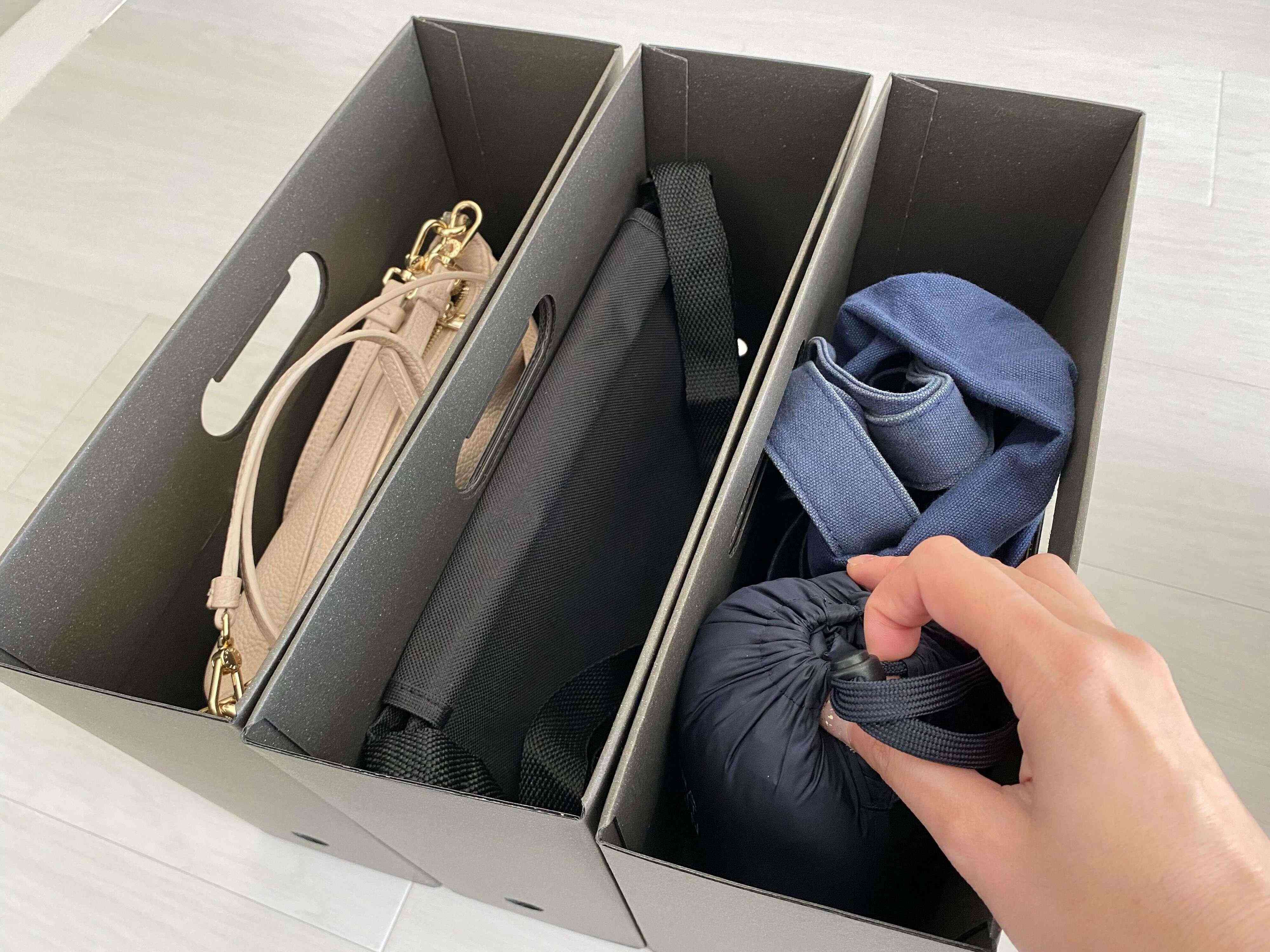 バッグや帽子などのファッショングッズ収納をするのにピッタリなサイズ感。柔らかいダンボール素材だけど、しっかり立てて置けるので型崩れもしにくいです。ポケッタブルアウターも袋に入れた状態で立ててすっきり入りましたよ!