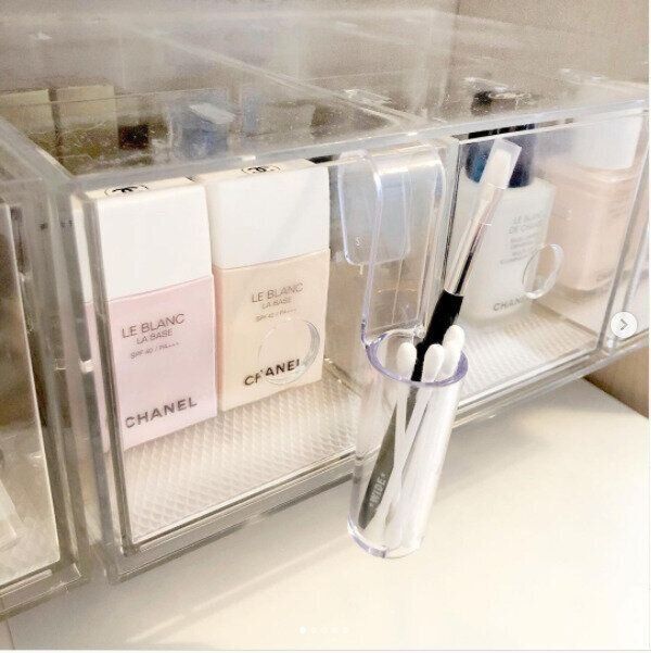 クリア素材でできたマルチホルダーはフックつきでちょっとしたスペースに引っ掛けて収納を増やせる優れものです。メイクブラシや綿棒など細かなものを入れておくのにもぴったりですし、どんな場所にも引っ掛けられるので使いみちは無限大です。