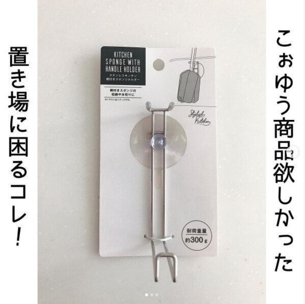 水筒や長めのコップを洗う際の柄つきスポンジはキッチンでの置く場所に困りがちですが、セリアから新登場した専用スポンジホルダーを使えばそんな悩みは即解決です。吸盤でシンクに取りつければ浮かせて収納もできるのでスポンジの水切りもしっかりできてオススメです。