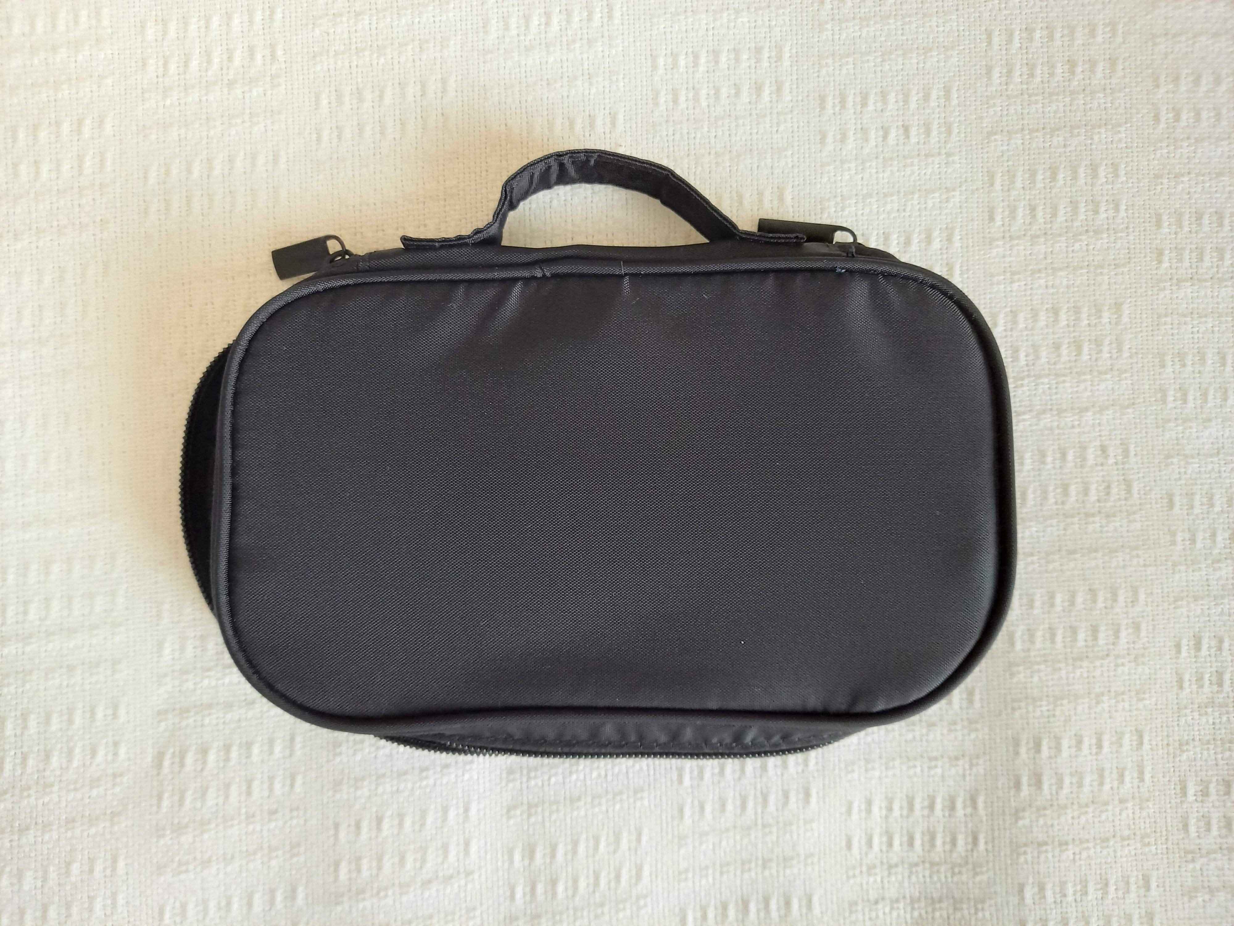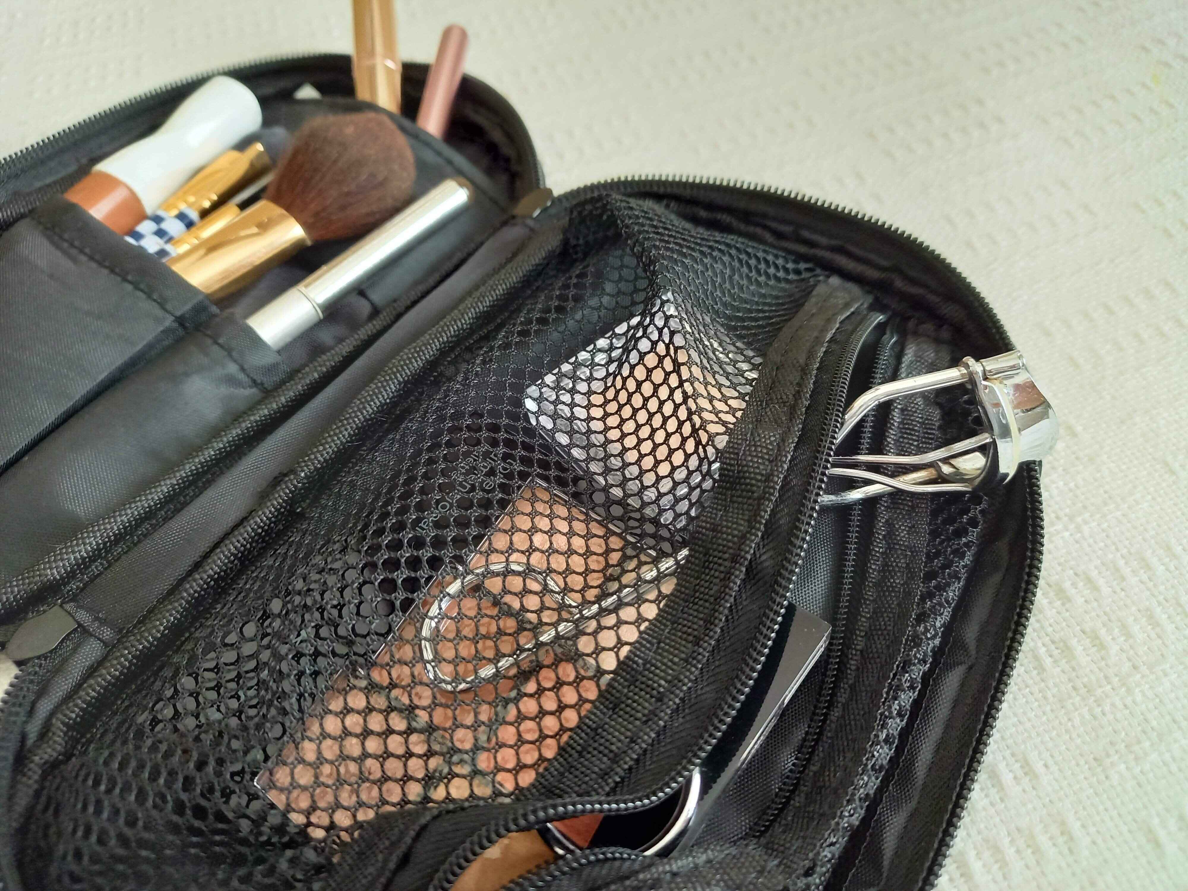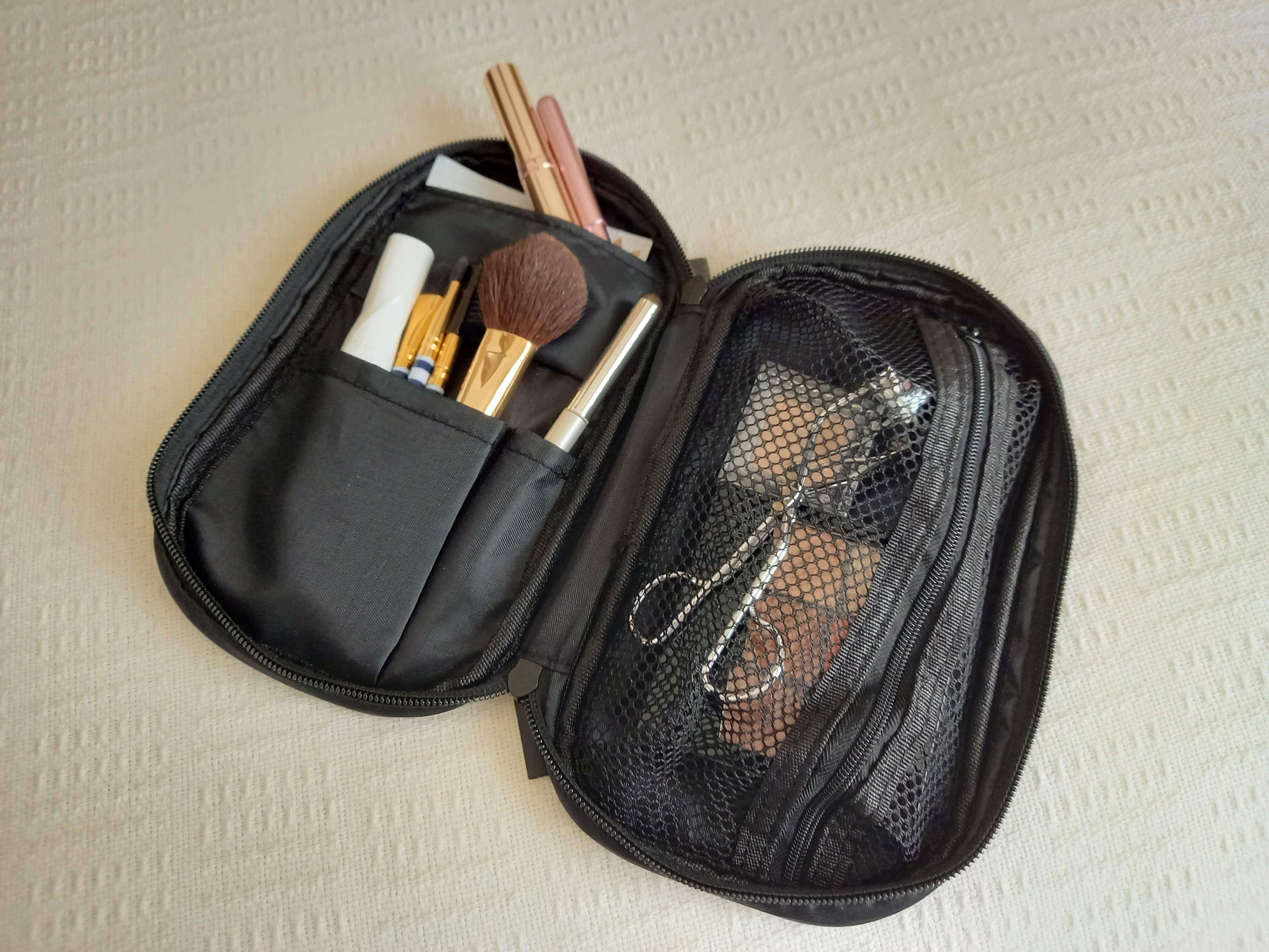 柄の長いブラシやペンシル型のアイメイク、幅のあるビューラーもしっかり収まります。ナイロン、ポリエステル素材なので、汚れてもサッと拭き取れ衛生的に使えますね。