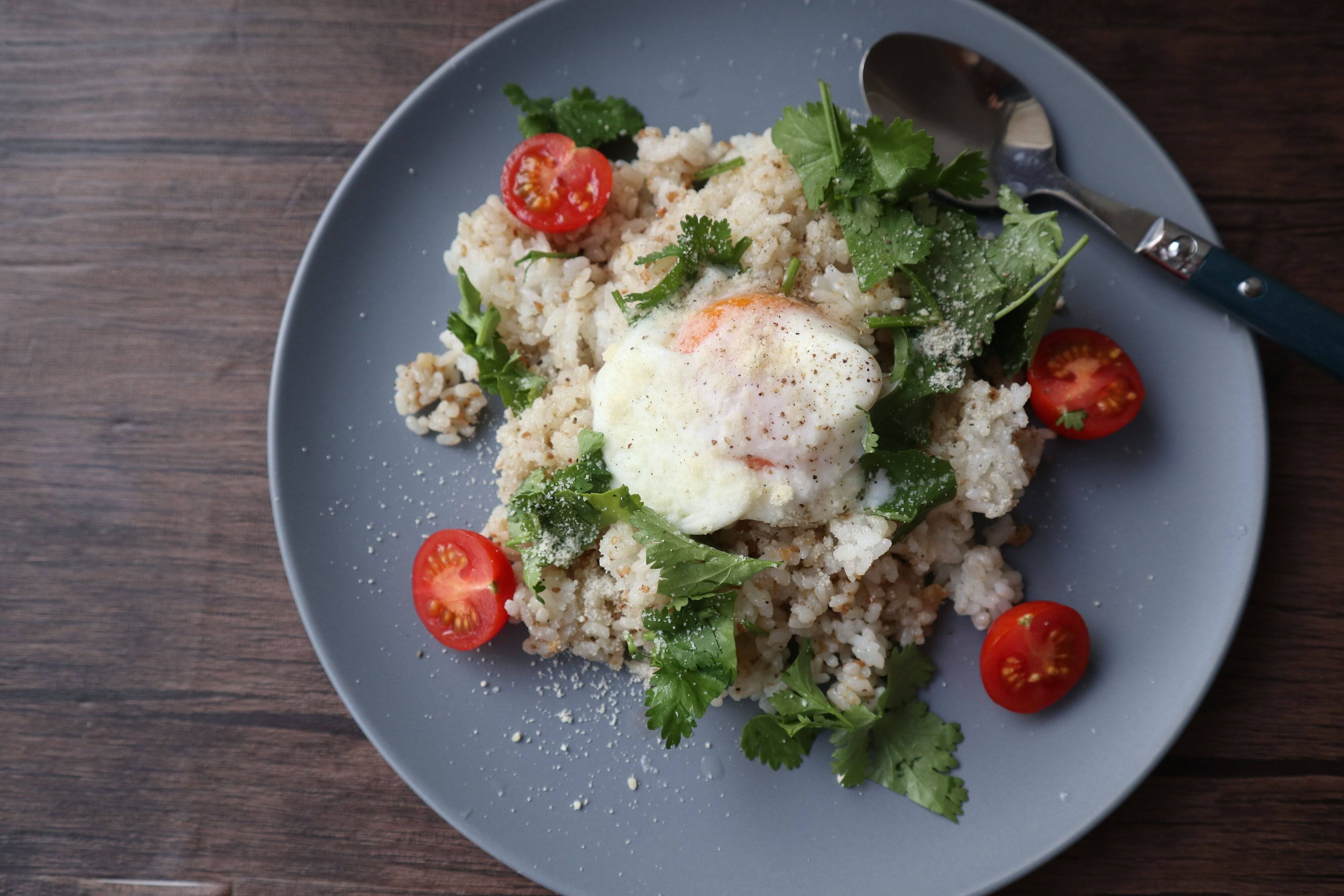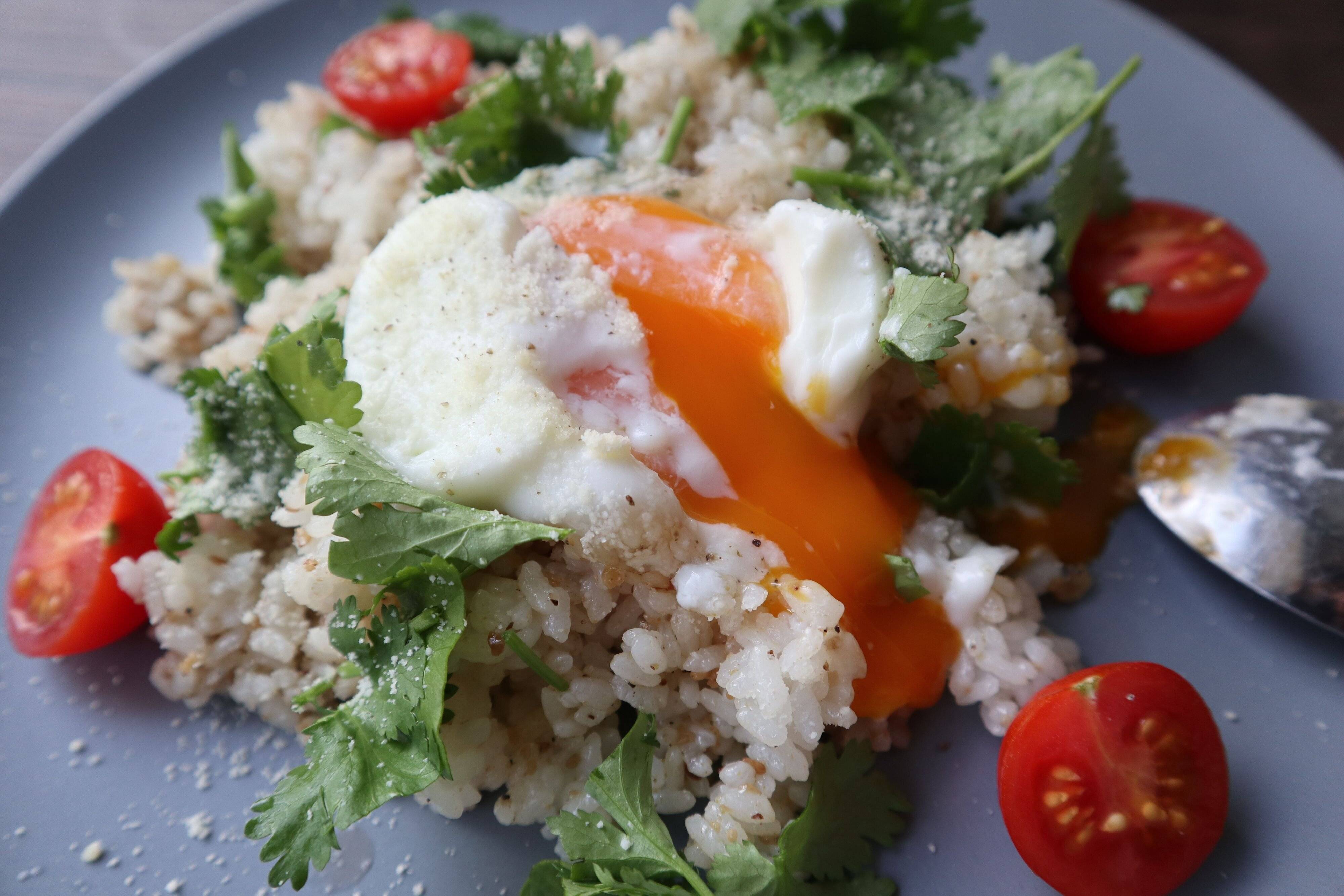 トッピングはお好みで。今回は、パクチー、ミニトマト、温玉、粉チーズ、ブラックペッパー。このほかにも、ナッツやソテーしたベーコン、レモンなどがおすすめです。