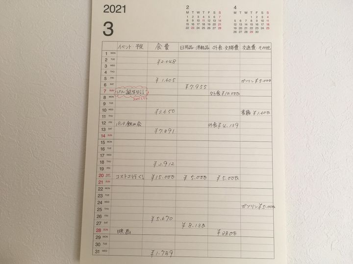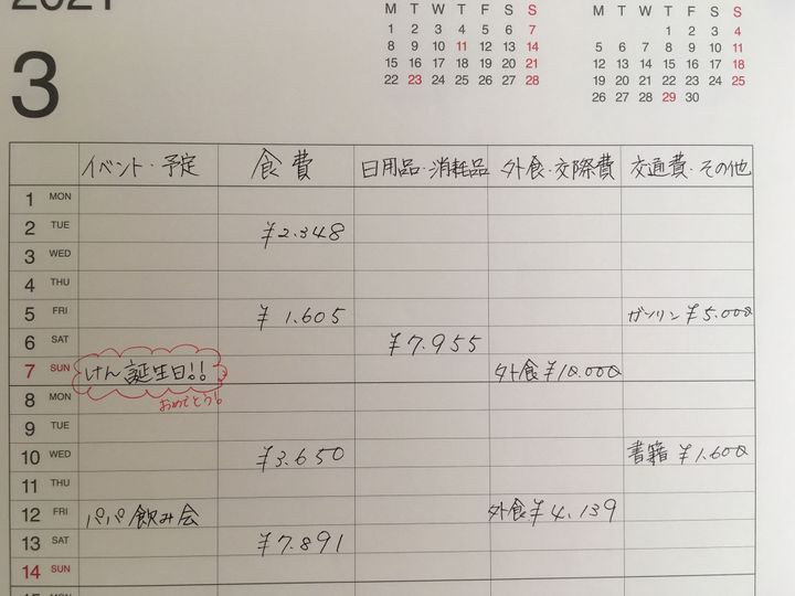 日付の横に家族の大きなイベントや予定の列をつくり記入。残りの4列には大まかな項目でのお金の動きを記入できるようにします。