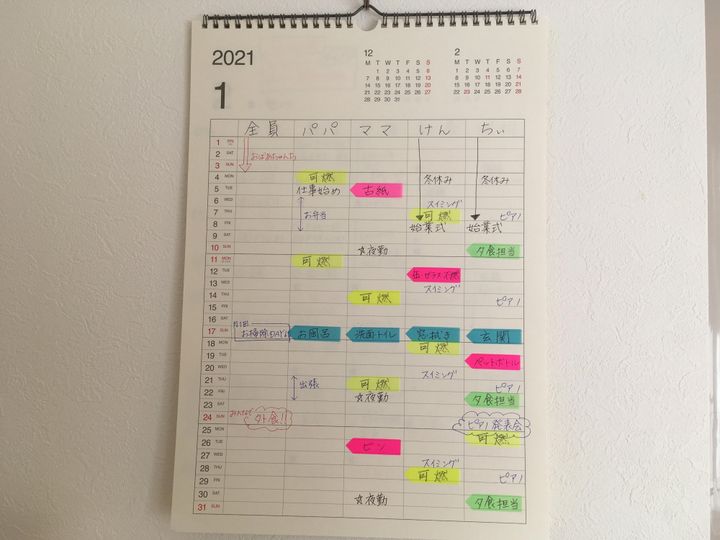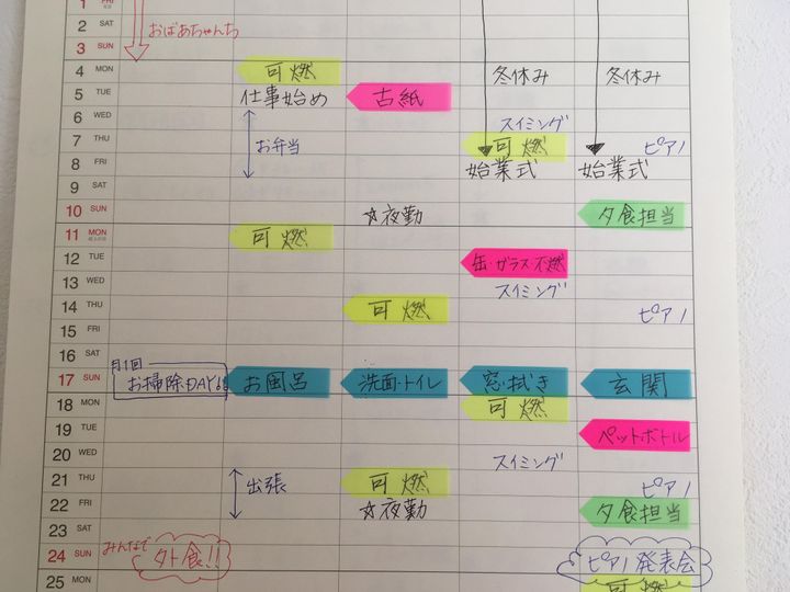 ゴミ出しなどで定期的に発生する予定は、使い回しのことも考えて付箋やマスキングテープなどを利用。ゴミの種類を記入して担当者の列に貼るようにすると、ゴミ当番も忘れることがなくなります。お手伝いの内容も記入して貼れば担当者も一目瞭然!