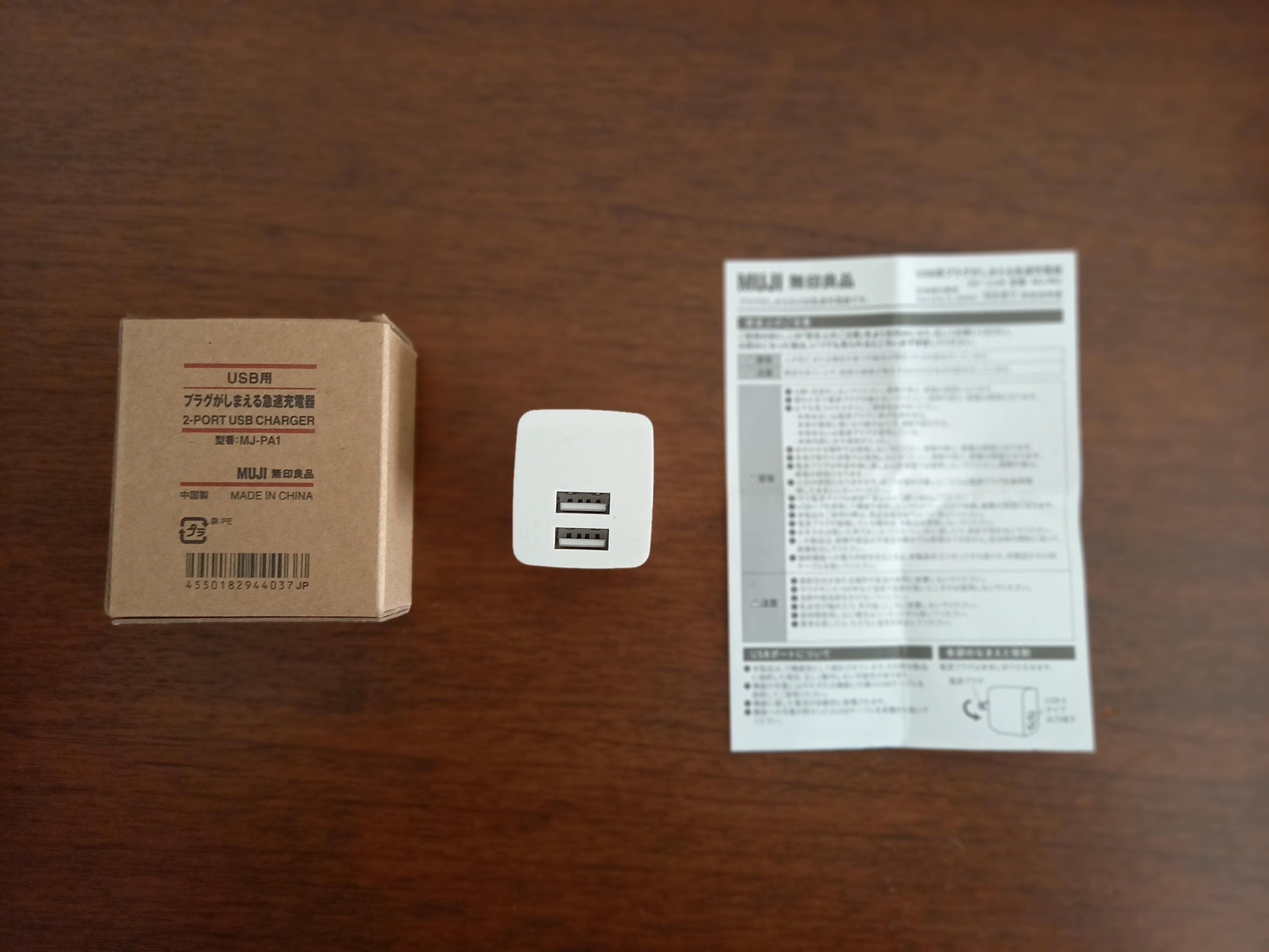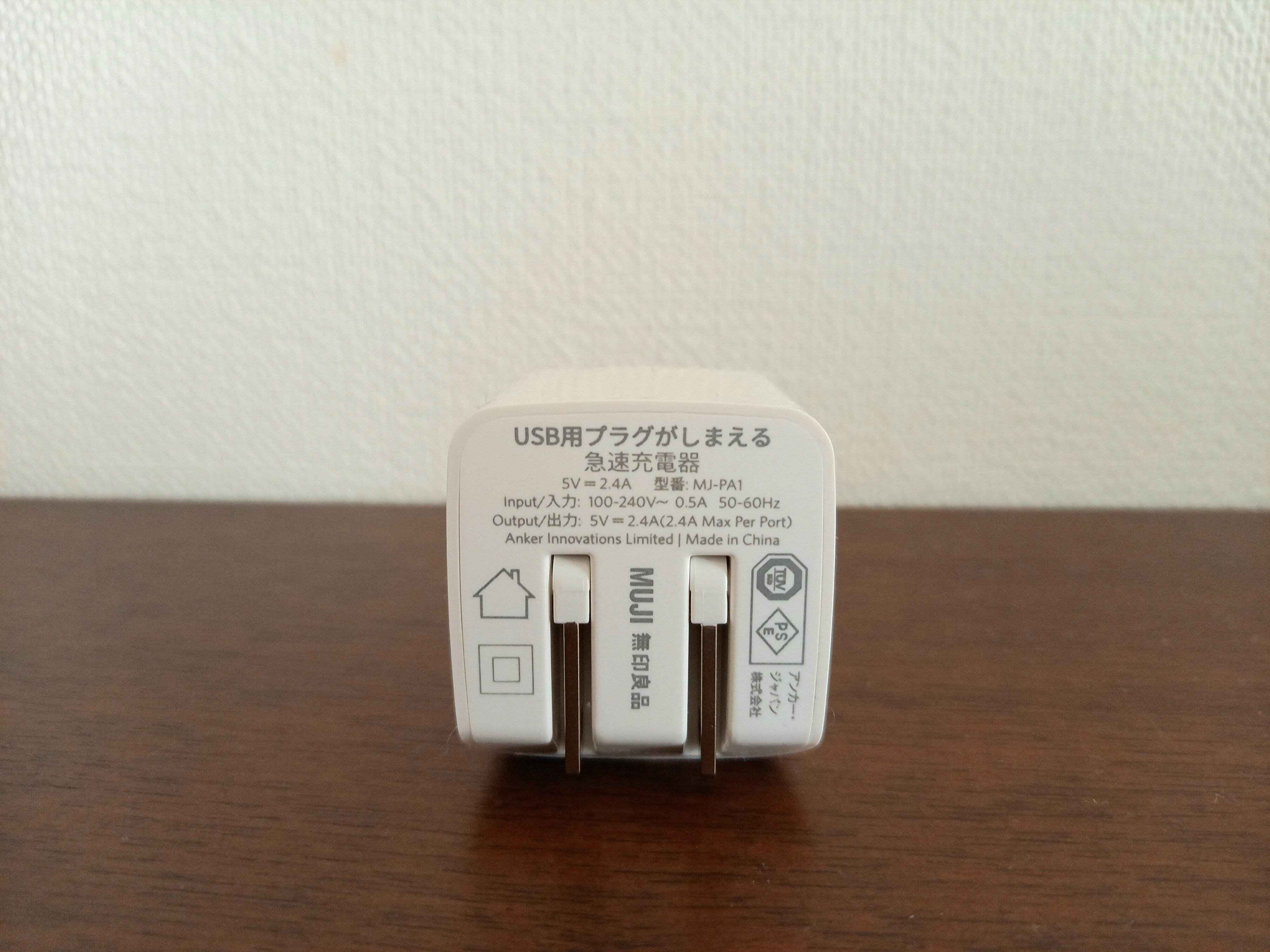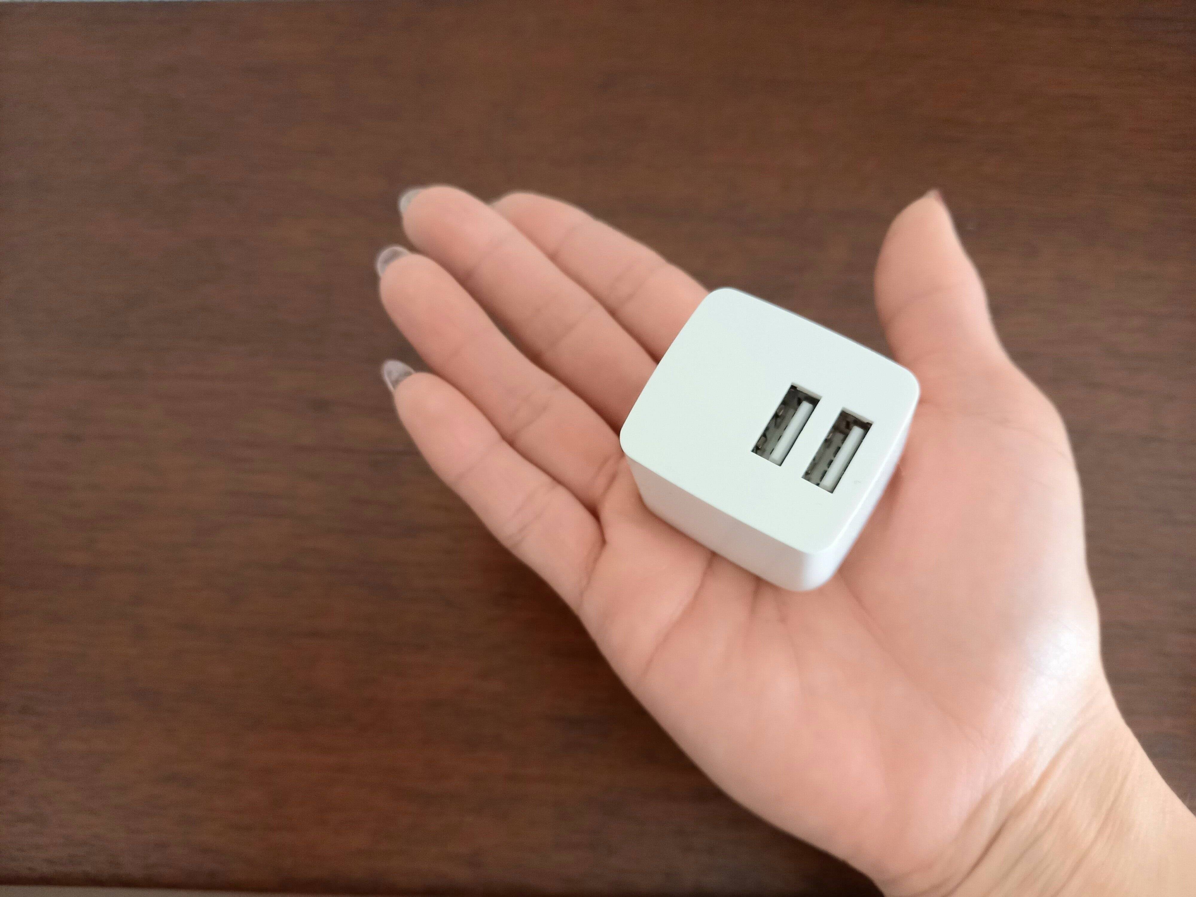 無印らしい真っ白のシンプルなバッテリー充電器。差し込み口が2つついているのもうれしいポイントです。2ポートで合計12Wの出力ができるので、その範囲内であれば2台の端末を同時充電することができますね。出力も、2.4Aの高出力なためすぐに充電できるのがいいですね。この性能で1,290円(税込)というお手ごろ価格なのもうれしいですね。