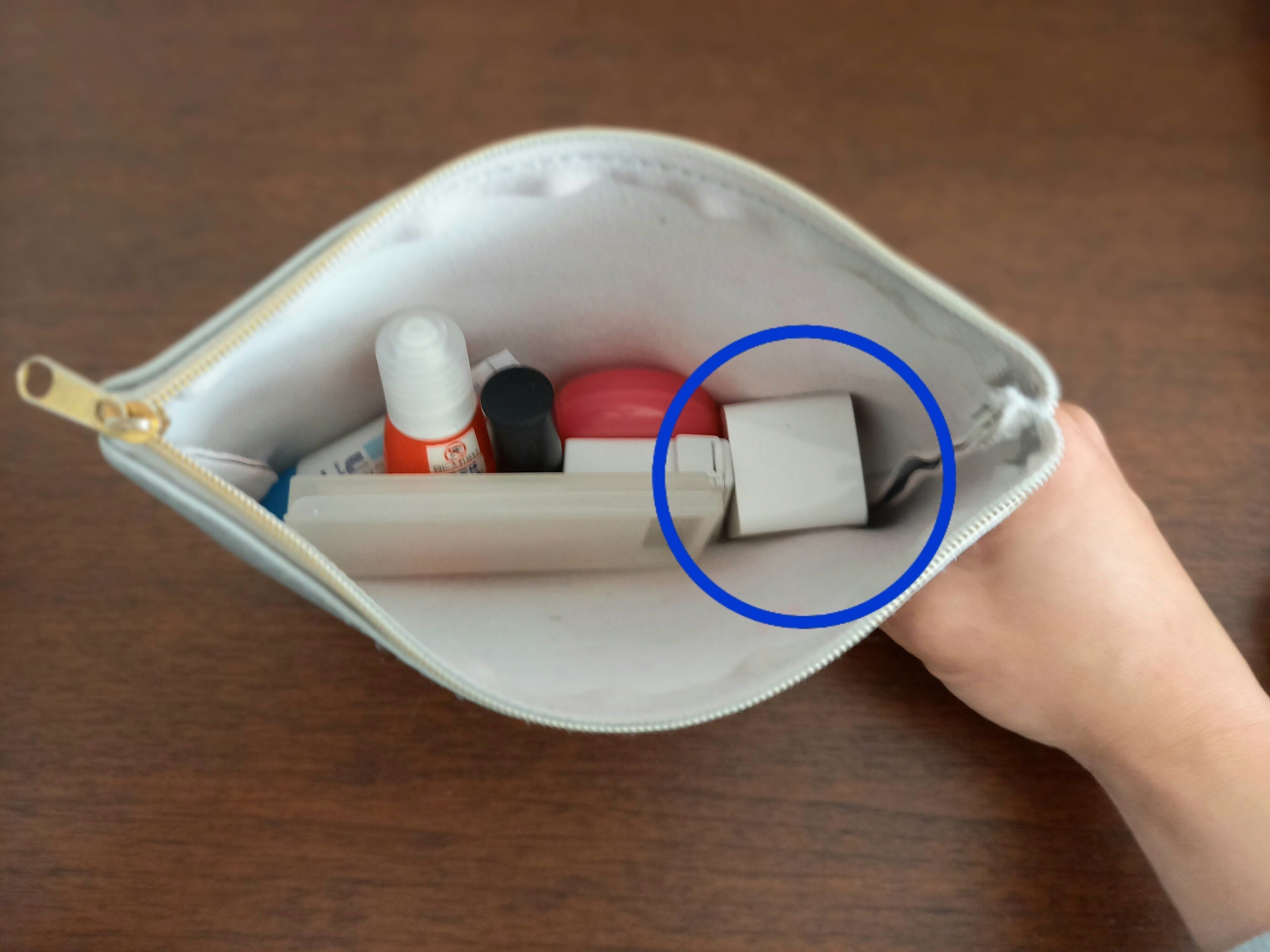 手のひらサイズで、とにかくコンパクトなので、持ち運びに最適です。写真のとおり、ポーチにもしっかり収まります。旅行や出張などにも気軽に持っていけそうすね。