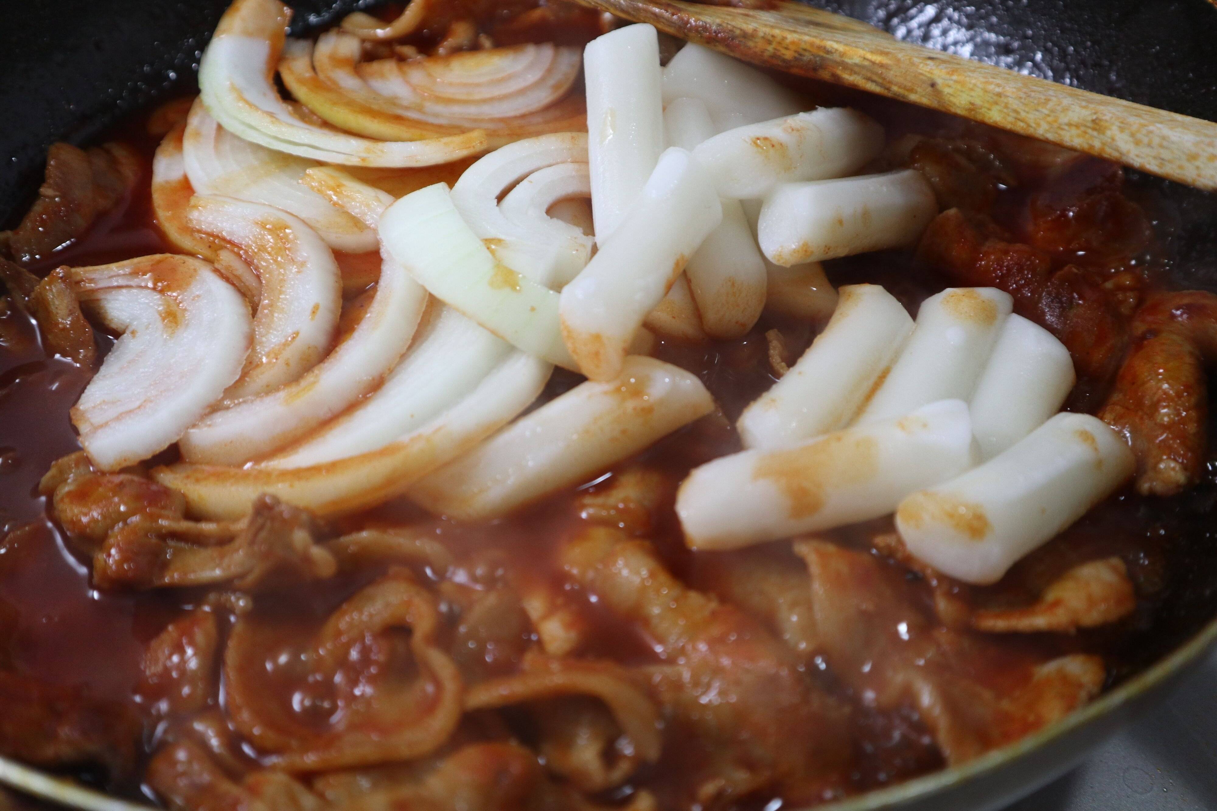 火がとおったら、トッポッキソース、水(350ml)を入れて煮立たせたら、トッポッキ、玉ねぎを加えて煮ます。
