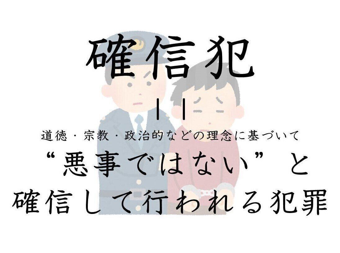 「確信犯」とは、「道徳・宗教・政治的な理念により"悪事でない"と確信しておこなわれる犯罪」という意味のある言葉です。「自分は正しいことをしているのだ」という信念を持っておこなわれる、思想犯や政治犯などがこれにあたります。