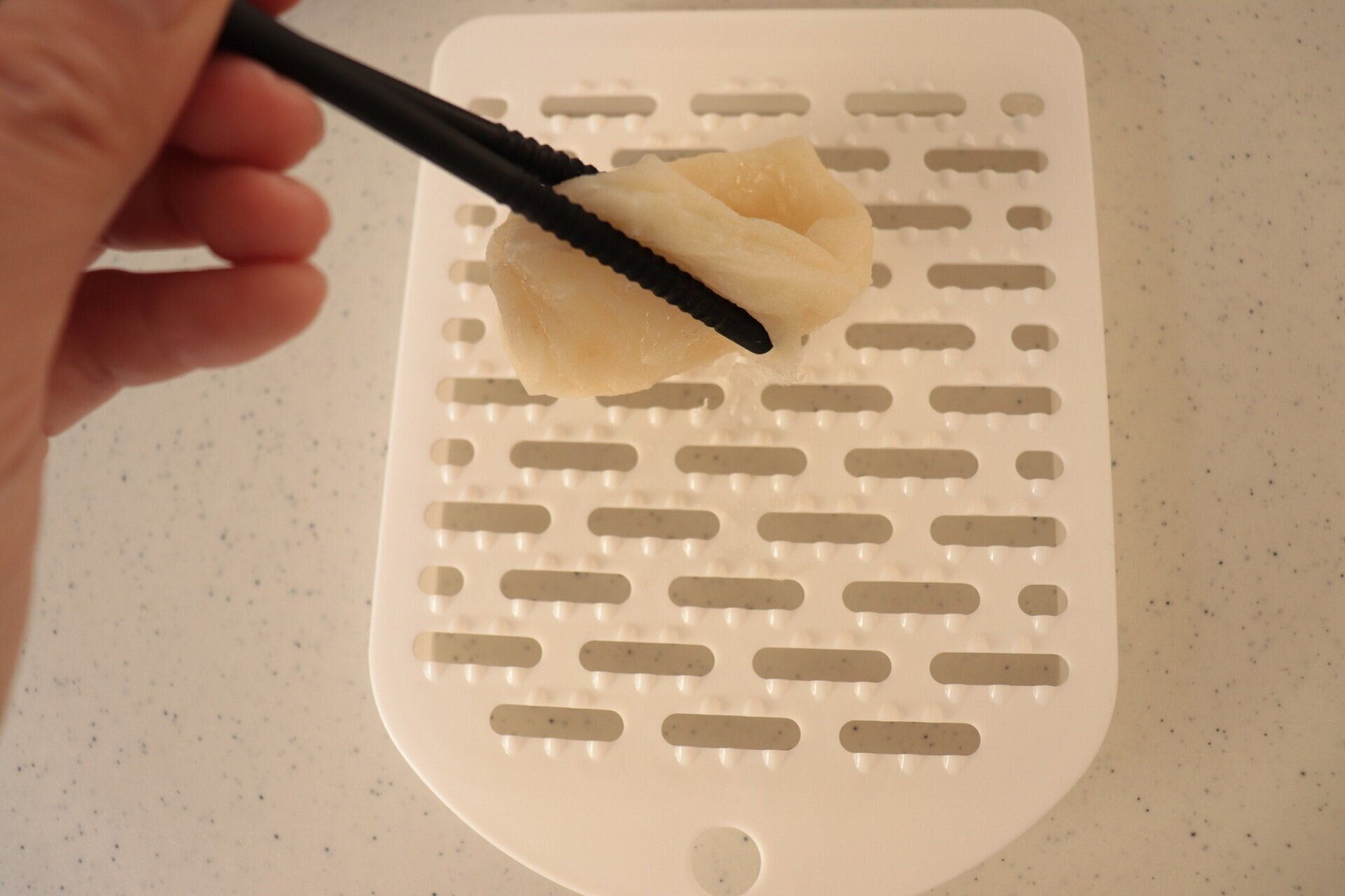 お皿だとすぐに持ち上げないとお餅がこびりついてしまうことが多いのですが、写真のとおりこの調理器具はこびりついていない!このギザギザした部分がお餅を取りやすくしてくれているようです。
