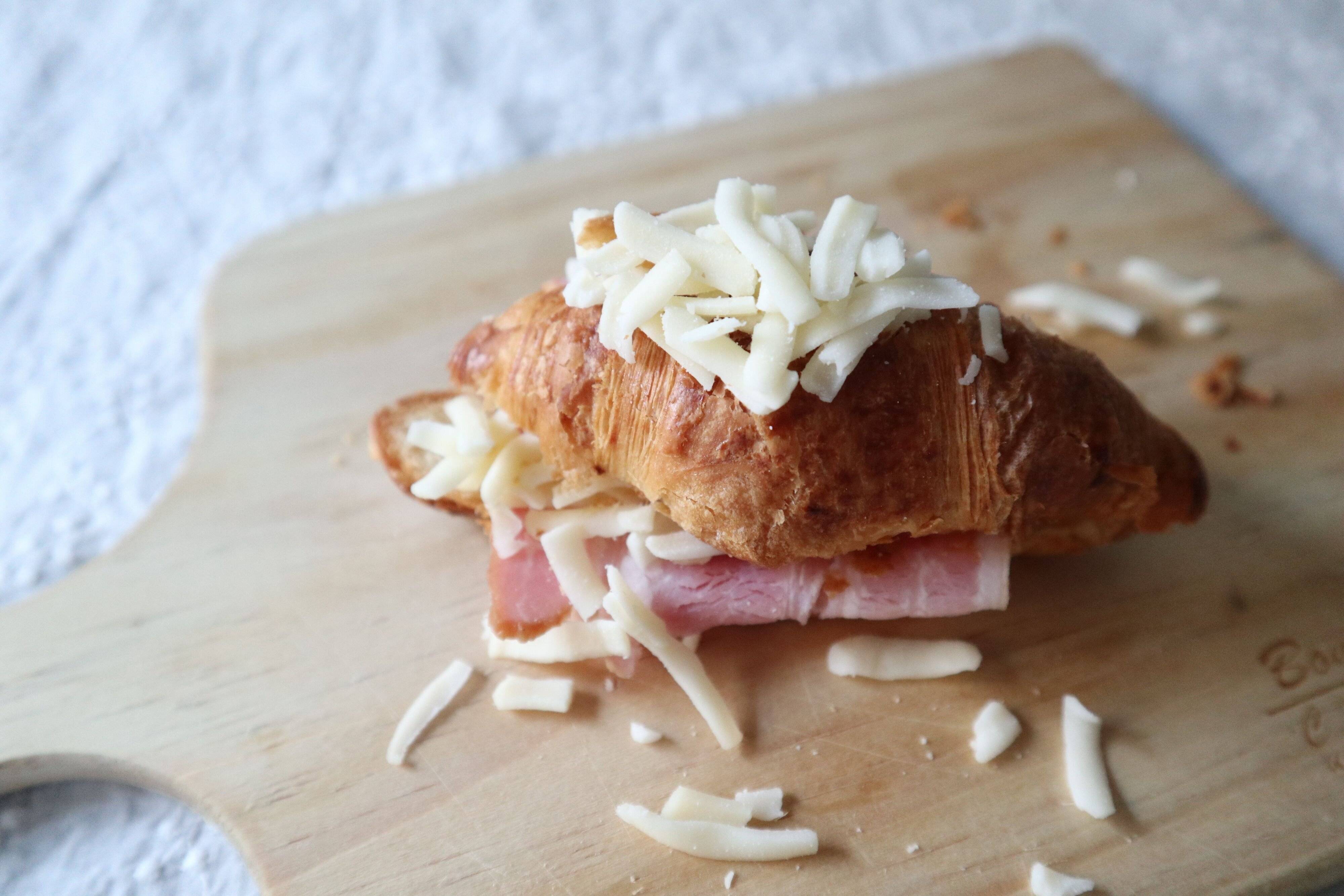 クロワッサンの厚さを半分に切り、ベーコンととろけるチーズをはさみ、上から軽く押さえてさらに上からとろけるチーズをのせます。トースターでチーズがこんがり焼けるまでトーストします。