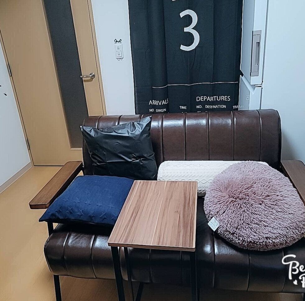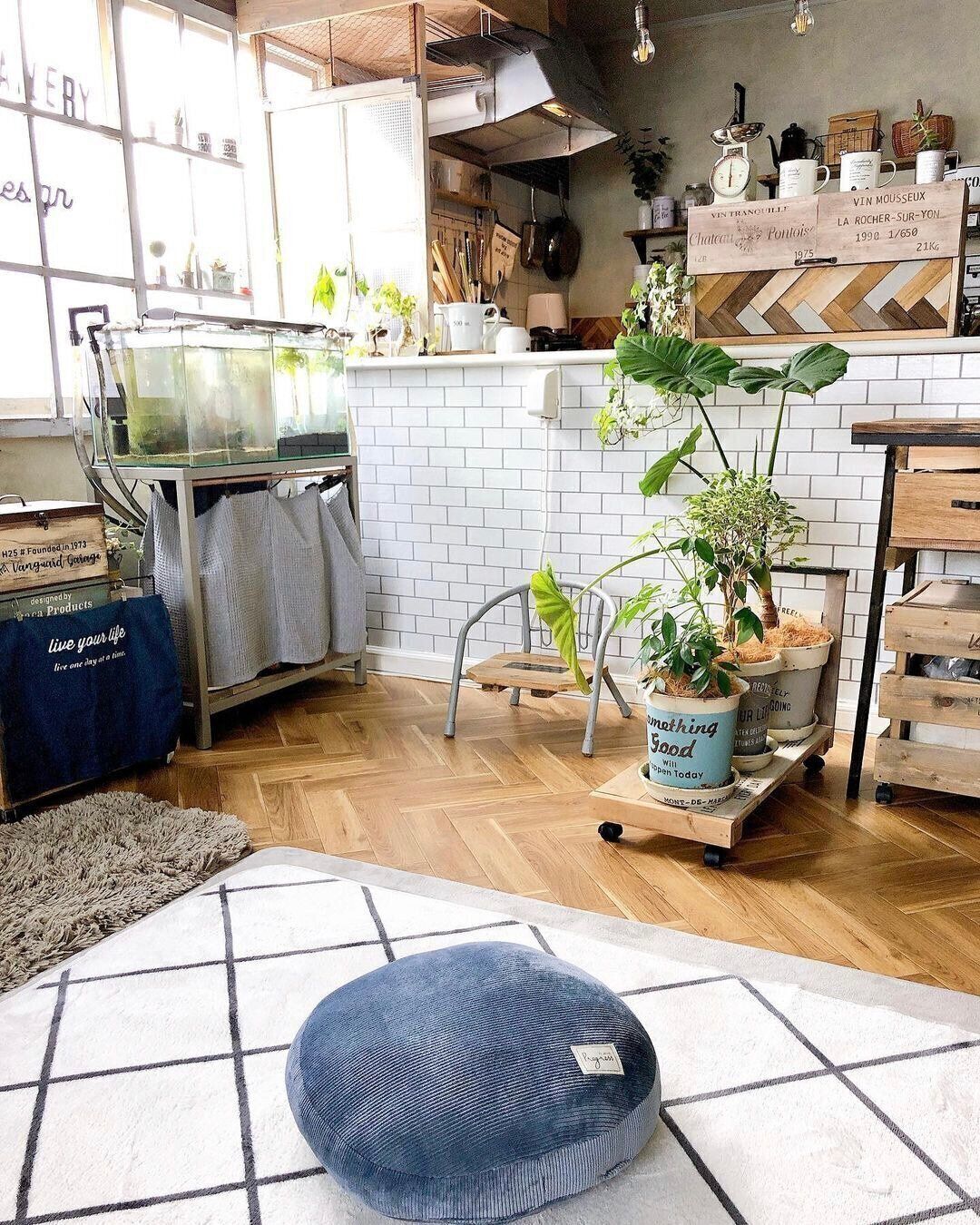ダイソーにはお部屋に馴染むシンプルなクッションもそろっていて、こちらのブルーとブラックのクッションはダイソーのもの。もこもこクッションなどと組み合わせても素敵です。