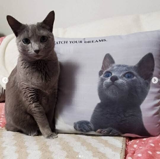 ロシアンブルーの子猫がプリントされたキュートなクッションカバー。SNS上でも、ネコ好きさんたちが「見たとたんに衝動買いした」という投稿が相次いだ人気アイテムです。もうどちらが本物かわかりません!
