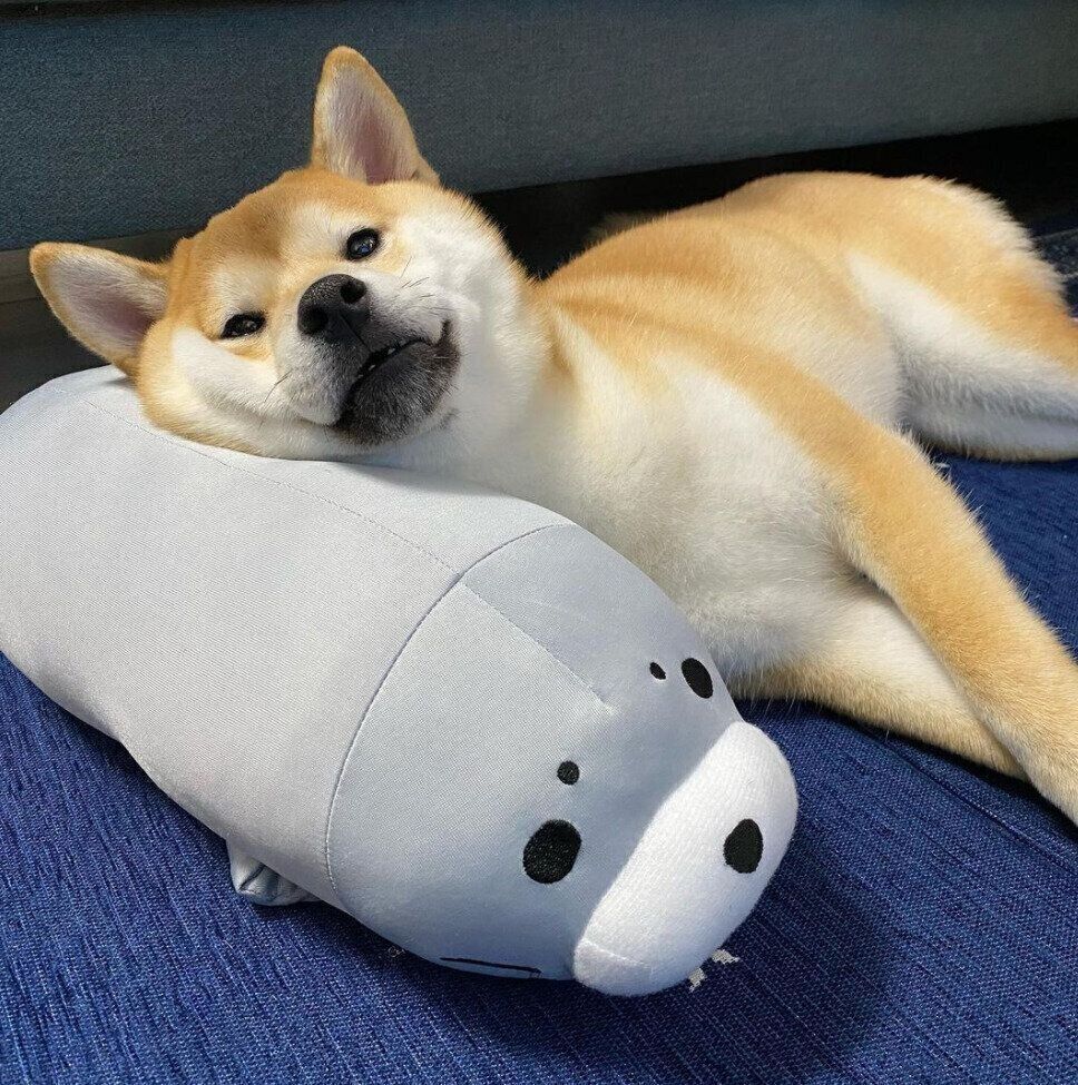 思わずひとめぼれしておうちに連れて帰りたくなる、ダイソーのアニマルデザインのもちもちクッション。キュートな柴犬さんもお気に入りのようで、見ているだけで癒されます。
