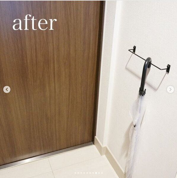 雨の日のぬれた傘は置き場所に困ってしまいますよね。こちらは玄関先にセリアのアイアンバーを取りつけ、傘を乾かす一時置き場にしている例です。玄関先に傘を立てて倒れたりすることも防げ、ストレスなく傘を乾かすことができます。限りあるスペースも有効に活用できていますね!