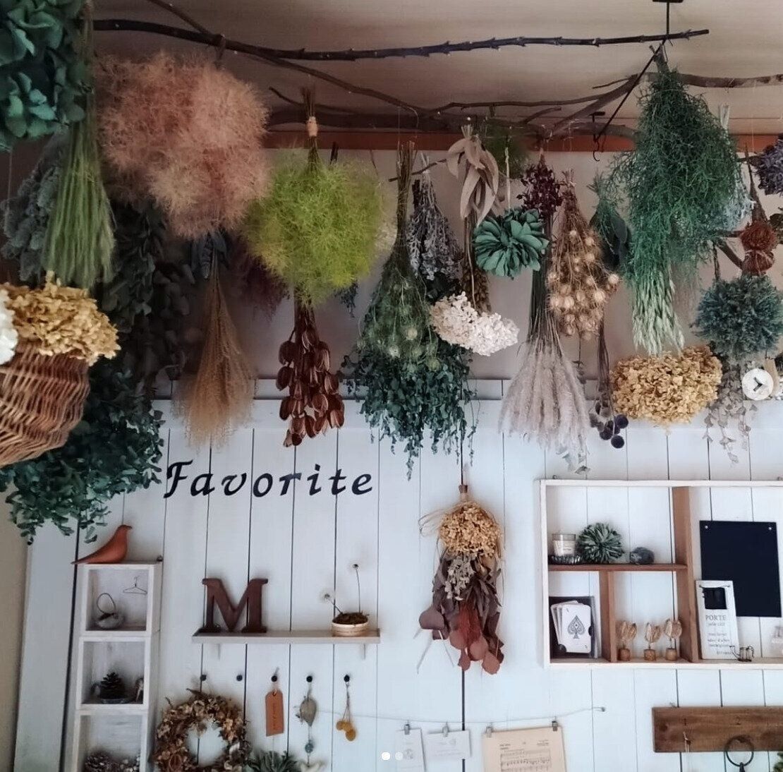 セリアのアイアンバー2つを天井に固定して、長い枝を渡してドライフラワーをレイアウトすれば、こんなに素敵なフラワーショップ風インテリアに!どんなお花を飾ろう…?と考える時間も楽しめそうです!
