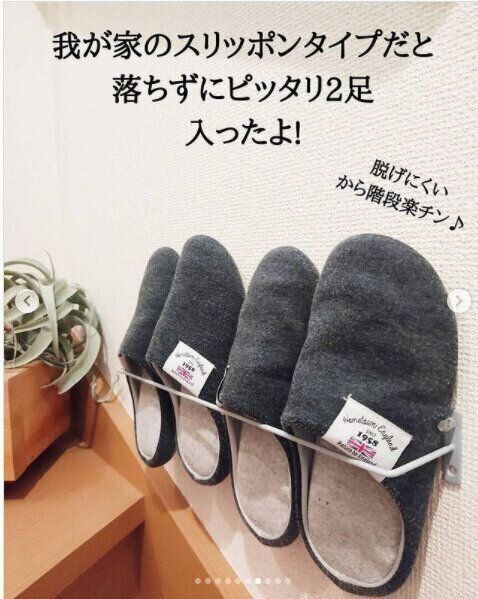 黒のアイアンバーを好みのカラーに塗装すれば、イメージがガラリとかわりお部屋のインテリアにも合うシンプルなデザインに大変身します。壁に画びょうで取りつけるだけでスリッパラックとしても活用できます。