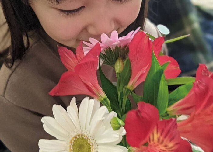 「すてき! 鮮やかな色味で、お部屋の雰囲気がパッと明るくなった感じ。お花は自分で買うと好みが偏るから毎回代わり映えがなくなってしまうのだけど、『東北六花』は旬のお花をセレクトしてくれるから、普段は選ばないようなお花が入っていて新鮮!どんなふうに飾ろうか、考える時間も好き」(oshimiさん)
