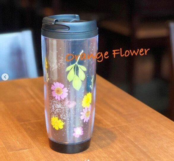 こちらはダイソーのタンブラーに押し花をつけてカスタマイズした例です。とても華やか!世界にひとつだけのタンブラーを作るのもよいですね。