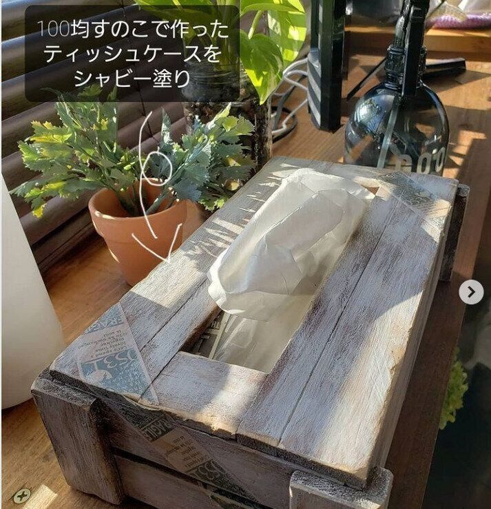 100均のすのこをDIYして、温かみのある素材感のティッシュケースに!ダイソーの水性ニスでウォールナットの色味に仕上げていたものを、アクリル絵の具の白でシャビ―塗りしてリメイクすることで、アンティークのおしゃれな雰囲気に仕上がっています!